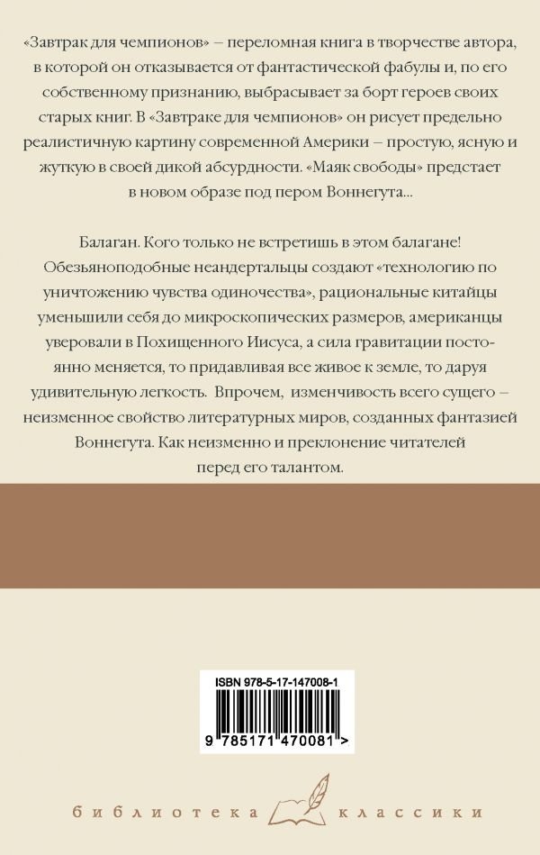 "Завтрак для чемпионов" – переломная книга в творчестве автора, в которой он отказывается от фантастической фабулы и, по его собственному признанию, выбрасывает за борт героев своих старых книг. В "Завтраке для чемпионов" он рисует предельно реалистичную картину современной Америки – простую, ясную и жуткую в своей дикой абсурдности.