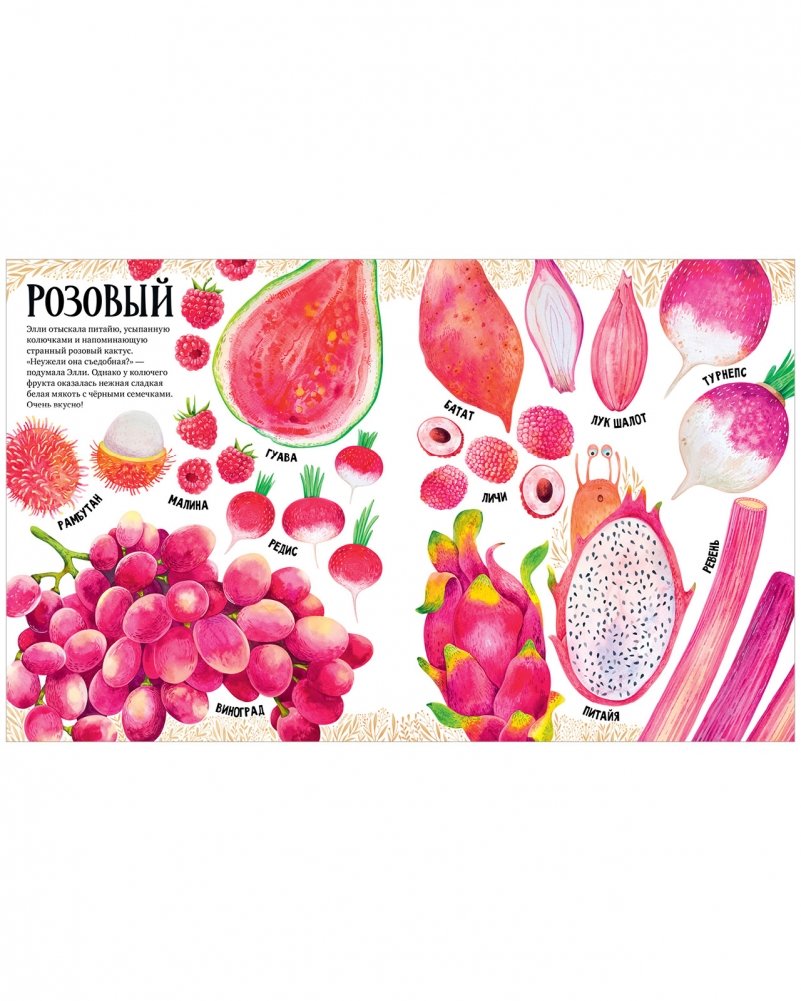 Следуйте за Элли по страничкам яркой книги, изучайте разные виды продуктов и их названия. Добро пожаловать в мир цвета и фантазии!?