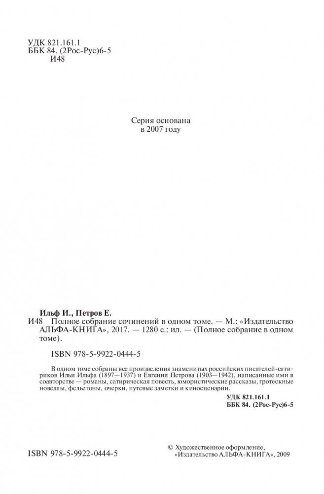 В одном томе собраны все произведения знаменитых российских писателей-сатириков Ильи Ильфа (1897-1937) и Евгения Петрова (1903-1942), написанные ими в соавторстве - романы, сатирическая повесть, юмористические рассказы, гротескные новеллы, фельетоны, очерки, путевые заметки и киносценарии.