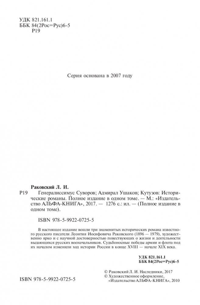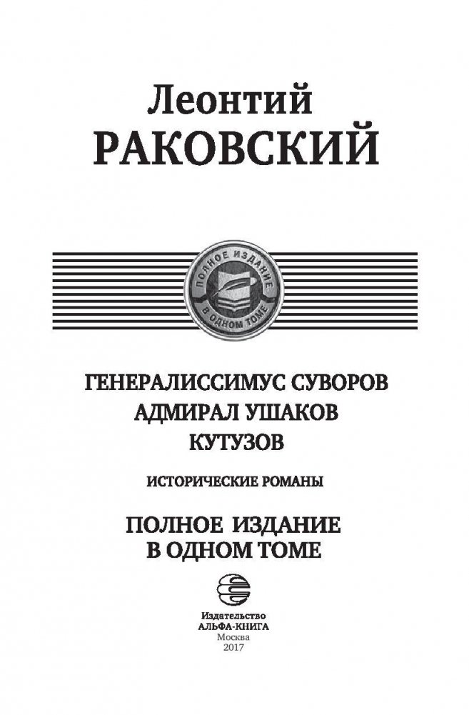 В настоящее издание вошли три знаменитых исторических романа известного русского писателя Леонтия Иосифовича Раковского (1896—1979), художественно ярко и с научной достоверностью повествующих о жизни и деятельности выдающихся русских военачальников. Судьбоносные победы армии и флота под их началом изменили ход истории России в конце XVIII — начале XIX века.