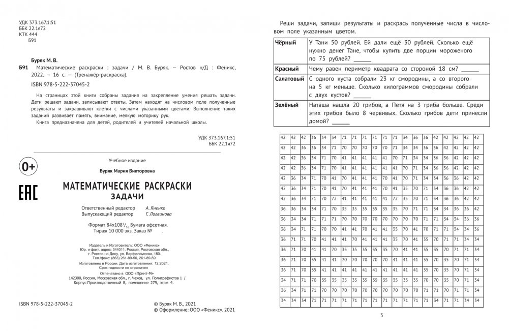 На страницах этой книги собраны задания на закрепление умения решать задачи. Дети решают задачи, записывают ответы. Затем находят на числовом поле полученные результаты и закрашивают клетки с числами указанными цветами. Выполнение таких заданий развивает память, внимание, мелкую моторику рук.