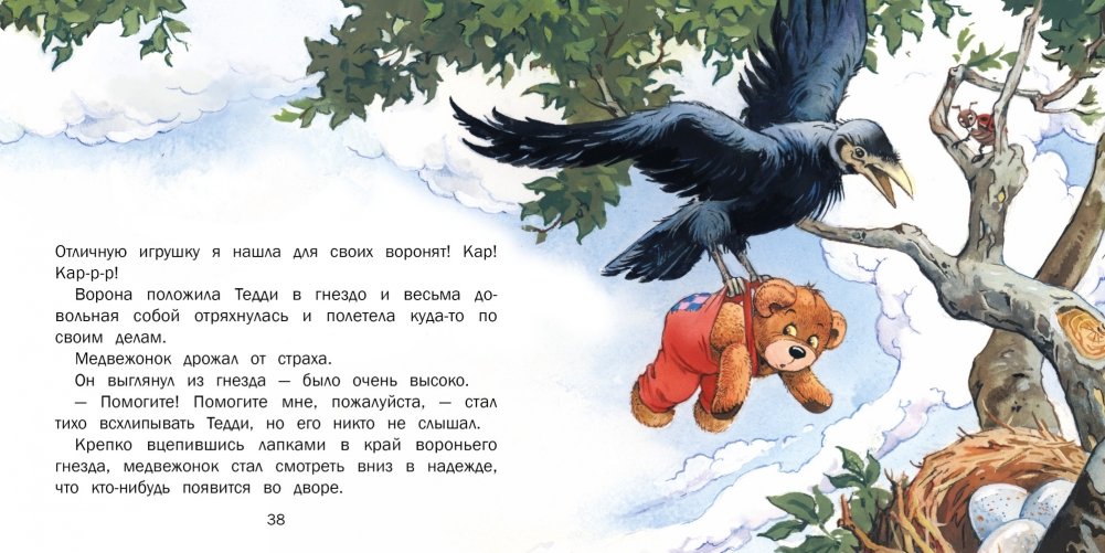 В магазине игрушек живет маленький непоседливый медвежонок Тедди. У него много друзей - медвежонок Эдди, кукла Долли, зайка Полли, клоун и оловянный солдатик. Они постоянно убегают из магазина и попадают в разные истории. В этой книжке игрушки сначала отправятся в путешествие на паровозике, а потом малыша Тедди похитит огромная ворона, и друзьям придется его выручать!