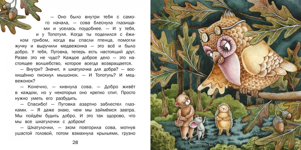 Маленький мышонок Пуговка услышал однажды, как мудрая сова говорила вороне, будто добро - это самое важное, и решил узнать: что же это за добро такое удивительное? Вдруг оно из сыра? Или блестит как драгоценный камень? Вместе со своим новым другом ёжиком Топотулем он отправляется на поиски добра.