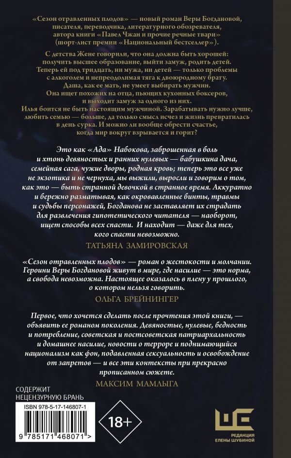 «Сезон отравленных плодов» — новый роман Веры Богдановой, писателя, переводчика, литературного обозревателя, автора книги «Павел Чжан и прочие речные твари» (шорт‑лист премии «Национальный бестселлер»).