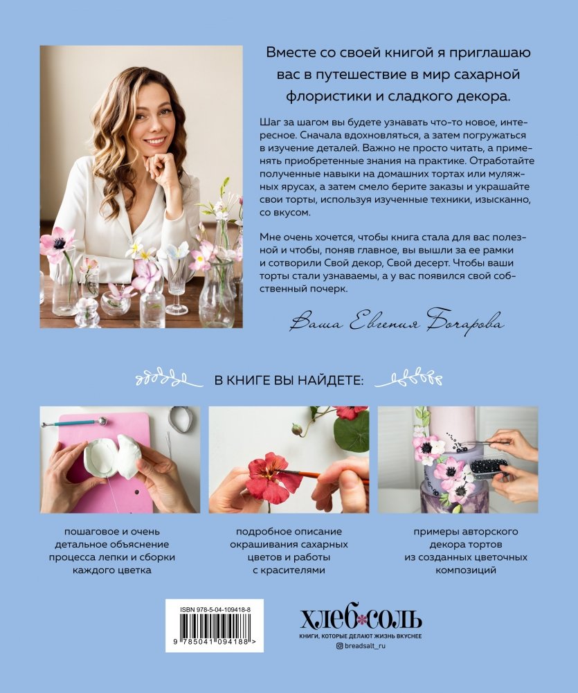 Хрупкие лилии, нежные пионы, яркие розы, трепетные магнолии и обворожительные анемоны застыли как живые. Сахарная флористика позволяет выполнить необыкновенные композиции для украшения тортов от самых простых цветов до экзотических букетов. Безусловно, создание цветочных композиций из сахарной мастики, вафельной бумаги или шоколада — дело не простое и самостоятельно получить достойный результат сложно, тут вам обязательно нужно экспертное мнение человека, который собрал воедино базу, подробный разбор инструментария, приемы и техники, основы работы с красителями, схемы окрашивания и свой многолетний опыт в вопросе. Все эти моменты вы откроете для себя в дебютной книги Евгении Бочаровой, которая с самых азов научит вас творить дивные украшения для тортов и расскажет, как создать цветочное настроение вашему празднику.