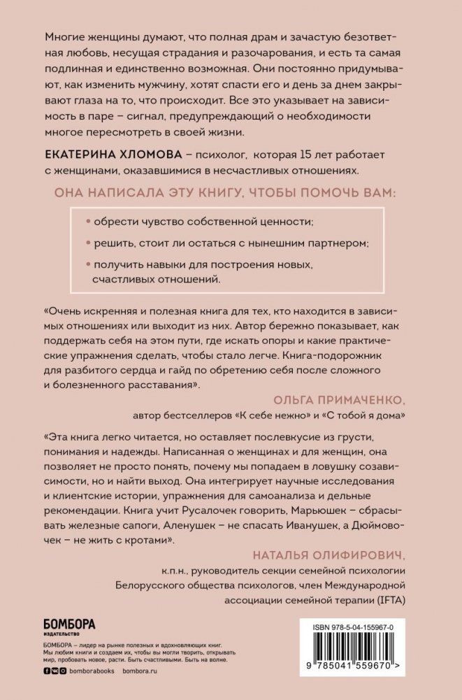 «Эта книга легко читается, но оставляет послевкусие из грусти, понимания и надежды. Написанная о женщинах и для женщин, она позволяет не просто понять, почему мы попадаем в ловушку созависимости, но и найти выход. Она интегрирует научные исследования и клиентские истории, упражнения для самоанализа и дельные рекомендации. Книга учит Русалочек говорить, Марьюшек — сбрасывать железные сапоги, Аленушек — не спасать Иванушек, а Дюймовочек — не жить с кротами». — Наталья Олифирович, к.п.н., руководитель секции семейной психологии Белорусского Общества Психологов, член Международной Ассоциации Семейной Терапии (IFTA)