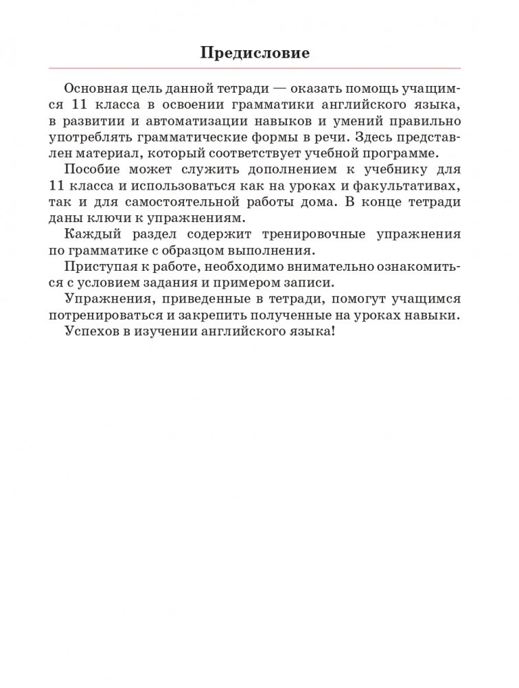 Пособие поможет ученикам 11 класса в освоении грамматики английского языка, в развитии и автоматизации языковых навыков и умения правильно употреблять грамматические формы в устной речи. В тетради представлен материал, соответствующий школьной программе. Она может служить дополнением к учебнику и использоваться как на уроках и факультативах, так и для самостоятельной работы дома. Каждый раздел содержит тренировочные упражнения с образцом выполнения для развития и совершенствования грамматических навыков. В конце тетради приводятся ключи к заданиям.