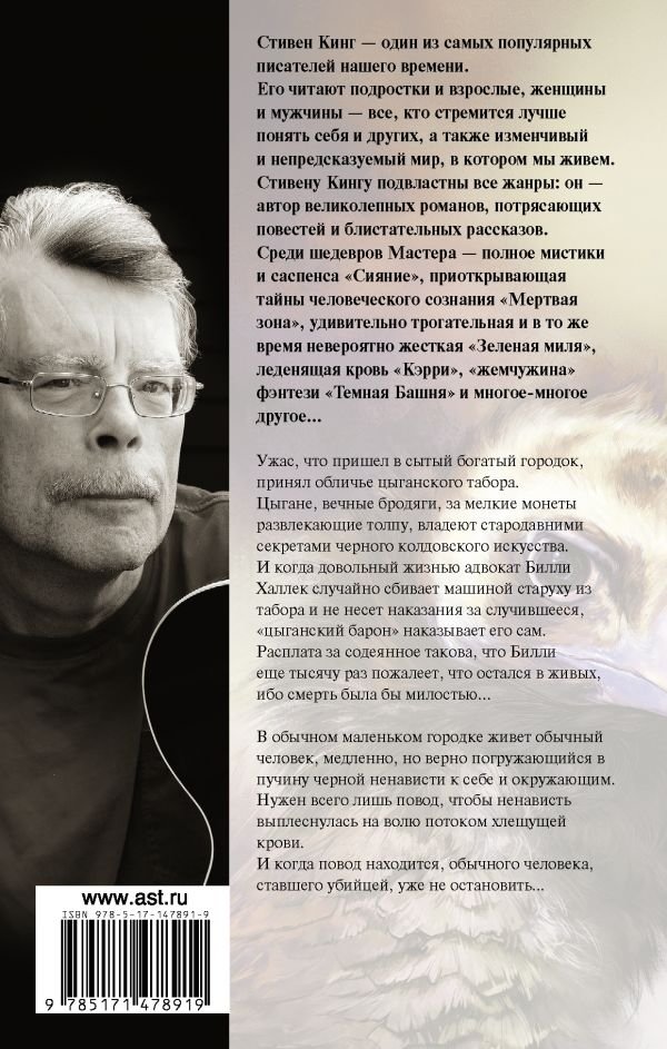 Ужас, что пришел в сытый богатый городок, принял обличье цыганского табора. Цыгане, вечные бродяги, за мелкие монеты развлекающие толпу, владеют стародавними секретами черного колдовского искусства. И когда довольный жизнью адвокат Билли Халлек случайно сбивает машиной старуху из табора и не несет наказания за случившееся, "цыганский барон" наказывает его сам. Расплата за содеянное такова, что Билли еще тысячу раз пожалеет, что остался в живых, ибо смерть была бы милостью...
