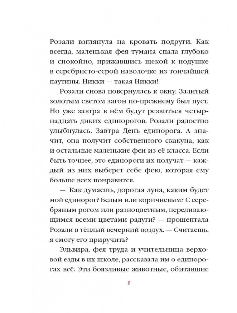 «День единорога» с первого взгляда погружает в волшебную атмосферу магической школы фей — её очаровательная обложка украшена сверкающими блёстками, а внутри вас ждут милые цветные иллюстрации! Всё это, а также небольшие объёмы текста, крупный шрифт и захватывающий сюжет, сделают эту книгу прекрасным подарком для любой юной читательницы и любительницы волшебства.