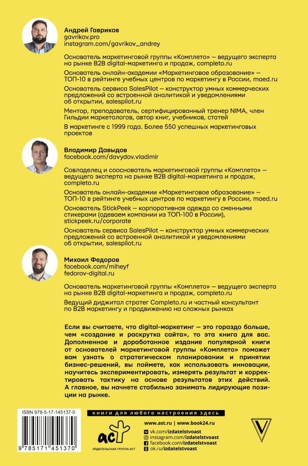 Если вы считаете, что digital-маркетинг – это гораздо больше, чем "создание и раскрутка сайта", то эта книга для вас. Дополненное и доработанное издание популярной книги от основателей маркетинговой группы "Комплето" поможет вам узнать о стратегическом планировании и принятии бизнес-решений, вы поймете, как использовать инновации, научитесь экспериментировать, измерять результат и корректировать тактику на основе результатов этих действий. А главное, вы начнете стабильно занимать лидирующие позиции на рынке.