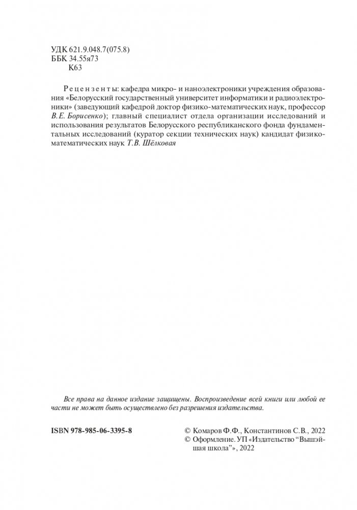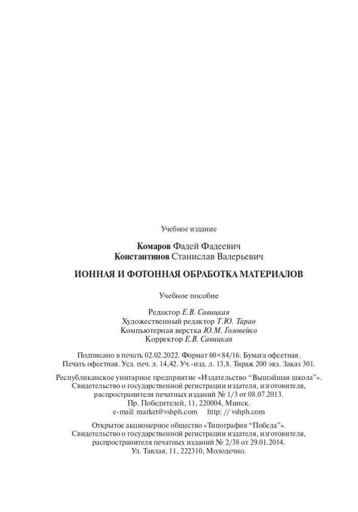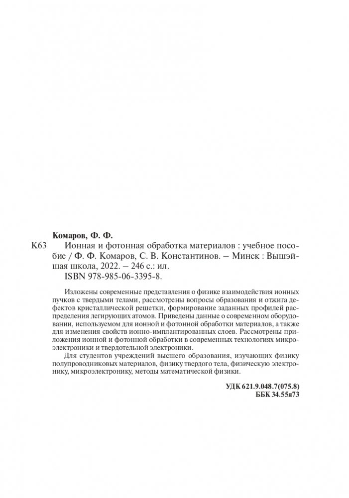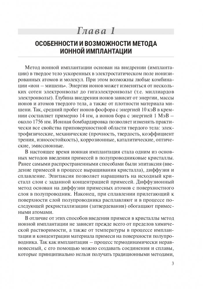 Изложены современные представления о физике взаимодействия ионных пучков с твердыми телами, рассмотрены вопросы образования и отжига дефектов кристаллической решетки, формирование заданных профилей распределения легирующих атомов. Приведены данные о современном оборудовании, используемом для ионной и фотонной обработки материалов, а также для изменения свойств ионно-имплантированных слоев. Рассмотрены приложения ионной и фотонной обработки в современных технологиях микроэлектроники и твердотельной электроники.