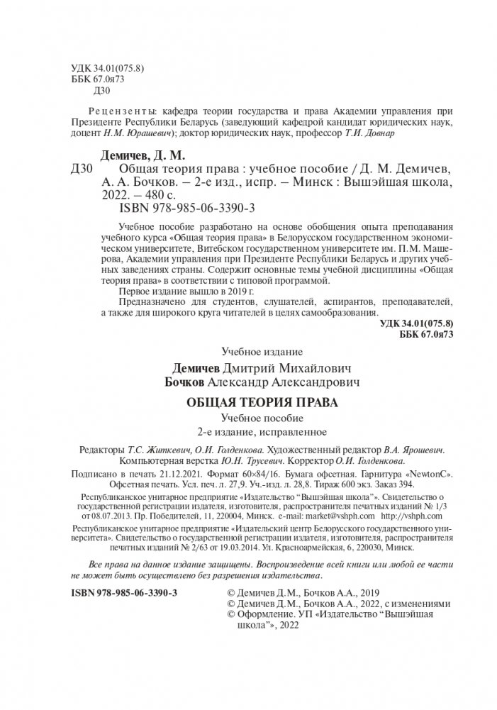 Учебное пособие разработано на основе обобщения опыта преподавания учебного курса «Общая теория права» в Белорусском государственном экономическом университете, Витебском государственном университете им. П.М. Машерова, Академии управления при Президенте Республики Беларусь и других учебных заведениях страны. Содержит основные темы учебной дисциплины «Общая теория права» в соответствии с типовой программой.