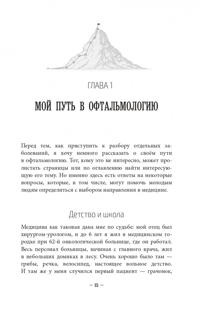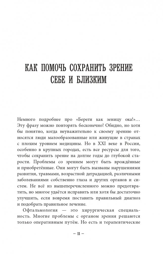 Катаракта, глаукома, амблиопия, возрастная дальнозоркость — есть сотни заболеваний глаз и почти всегда только одно настоящее лечение - хирургическое. Люди традиционно боятся любых оперативных вмешательств на лице. Но это не про глаза. Видеть хорошо сегодня можно в любом возрасте. Главное — своевременно обратиться ко врачу. В отличие от других областей медицины, в офтальмологии совершены невероятные прорывы (и о них мало кто знает). Более того, современные техники лечения доступны и распространены: практически каждую патологию можно вылечить, если своевременно обратиться ко врачу. В книге собраны различные советы по сохранению и восстановлению зрения и описаны современные методики помощи пациентам.