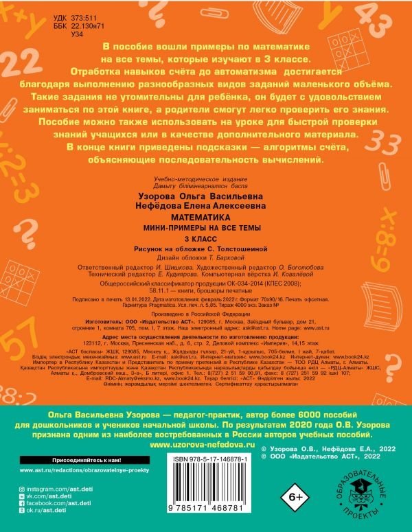 В пособие вошли примеры по математике на все темы, которые изучают в 3 классе. Отработка навыков счёта до автоматизма достигается благодаря выполнению разнообразных видов заданий. В конце книги приведены подсказки – алгоритмы счёта, объясняющие последовательность вычислений. Маленький объем заданий не утомителен для ребёнка, и он будет с удовольствием заниматься по этой книге, а родители смогут легко проверить его знания. Такие задания также удобно использовать на уроке для мини-контрольной или в качестве дополнительного материала.