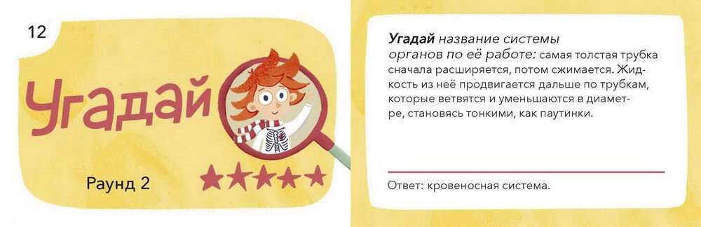 В ней два раунда, и в свой ход нужно выбрать одну из карт, зная только тип вопроса и его сложность. Не уверен, что ответил правильно? Не переживай, на каждой карточке есть ответ. А ещё дядя Кузя написал заметки, где собрал более подробные ответы на вопросы и самые интересные факты об устройстве человеческого тела и его здоровье.