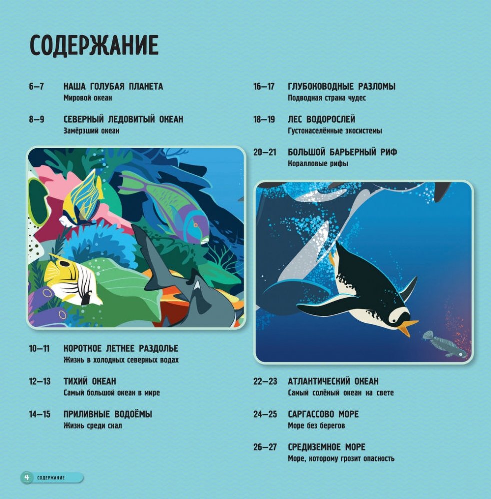 На каждом развороте — рассказ о гидросфере, течениях, глубоководных впадинах, водорослевых лугах, мангровых зарослях, коралловых рифах — и обо всех обитателях подводных и надводных экосистем, какие только есть на Земле.
