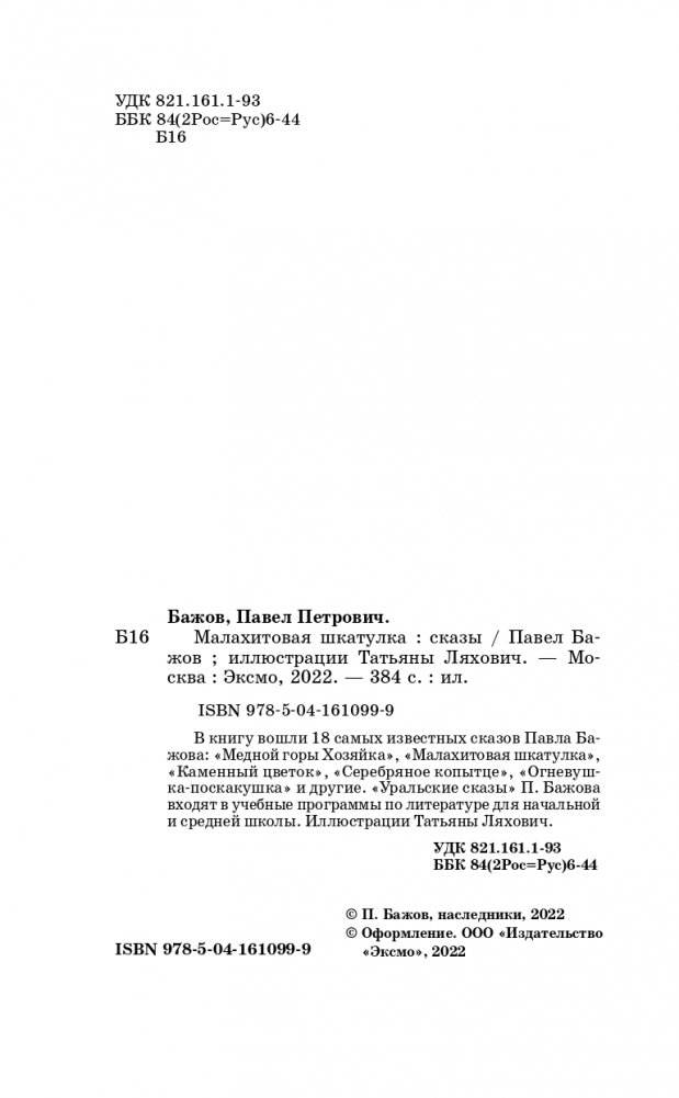 В книгу вошли 18 самых известных сказов Павла Бажова: "Медной горы Хозяйка", "Малахитовая шкатулка", "Каменный цветок", "Серебряное копытце", "Огневушка-поскакушка" и другие. "Уральские сказы" П. Бажова входят в учебные программы по литературе для начальной и средней школы. Иллюстрации Татьяны Ляхович.