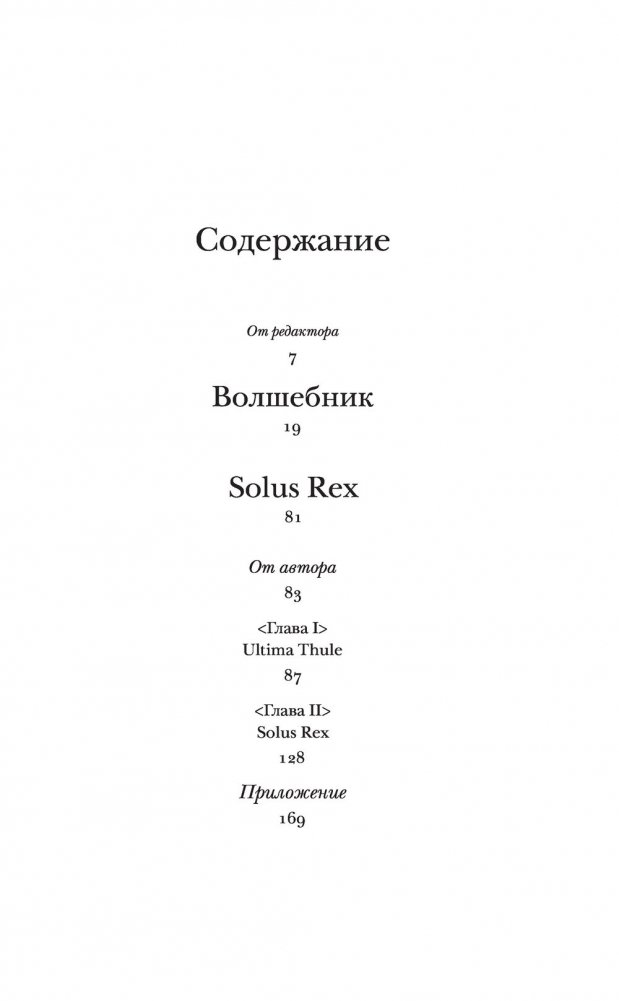 В это издание вошли два произведения Владимира Набокова, написанных в Париже в конце 1930-х – начале 1940-х перед отъездом писателя в Америку. “Волшебник” – повесть, идейно предшествующая созданию романа “Лолита”. В послесловии к изданию 1956-го года Набоков пишет, что ее прототипом был “рассказ, озаглавленный “Волшебник”… Героя звали Артур, он был среднеевропеец, безымянная нимфетка была француженка, и дело происходило в Париже и Провансе. Он у меня женился на больной матери девочки, скоро овдовел и после неудачной попытки приласкаться к сиротке в отельном номере бросился под колеса грузовика.” По воспоминаниям Набокова, он уничтожил рукопись повести, но позже ее единственный экземпляр обнаружился в бумагах писателя. Вторая часть книги – незаконченный роман “Solus Rex”. Набоков написал две первые главы и больше к задуманному не возвращался. Главы, однако, дополняют друг друга и образуют собой композиционное единство. Это две истории, происходящие как бы в параллельных мирах – в реальном и сказочном, где герои и мотивы перекликаются, одно событие неожиданным образом отражается в другом. Набоков создает призрачный, текучий мир, где портрет дельца проглядывает в принце, а в короле мы узнаем художника.
