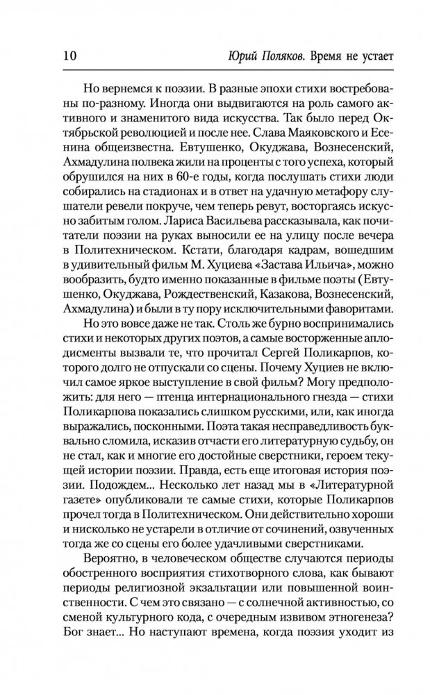 Книга "Время не устает" - последний, двенадцатый том собрания сочинений известного русского писателя Юрия Полякова, успешно работающего в разных жанрах. Он дебютировал как поэт в начале 1970-х, став одним из лидеров поколения поэтов, рожденных в пятидесятые годы. В этот том вошли стихи, сочиненные почти за полвека. Среди них - известные строфы, выходившие в периодике и включавшиеся автором в сборники, а также никогда не публиковавшиеся, хранившиеся в архиве и подготовленные специально для данного издания. Ранняя лирика Полякова принадлежит к лучшим образцам советской поэзии. Не оставят читателей равнодушными острые сатирические стихи на злобу дня, а также новые произведения, написанные зрелым мастером в последние годы. В книгу также включена известная работа Полякова о фронтовой поэзии "Между двумя морями", посвященная жизни и творчеству Георгия Суворова (1919-1944).