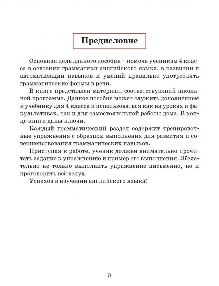 Эта тетрадь поможет ученикам 4 класса в освоении грамматики английского языка, в развитии и автоматизации языковых навыков и умения правильно употреблять грамматические формы в устной речи. В пособии представлен материал, соответствующий школьной программе. Оно может служить дополнением к учебнику и использоваться как на уроках и факультативах, так и для самостоятельной работы дома.