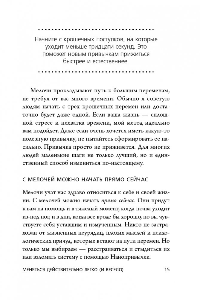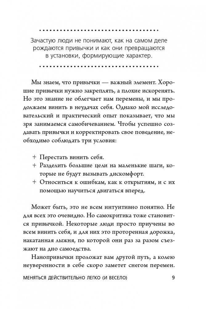 Кто сказал, что перемены должны отнимать много сил? Они могут быть легкими! Начните с двух отжиманий в день, а не с двухчасовой тренировки; или делайте пять глубоких вдохов каждое утро, а пытайтесь просидеть целый час в позе лотоса. Вы не поверите, но крошечные действия способны творить чудеса!