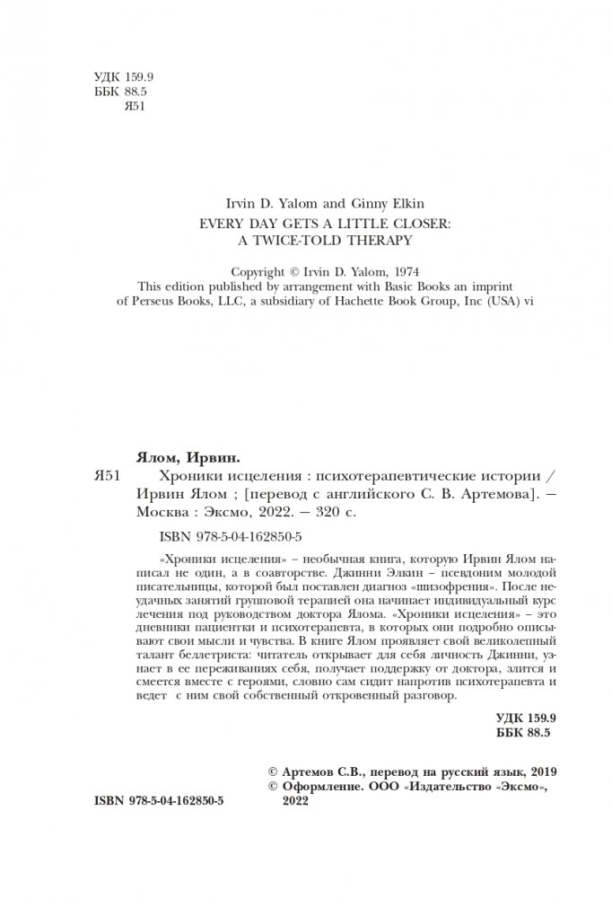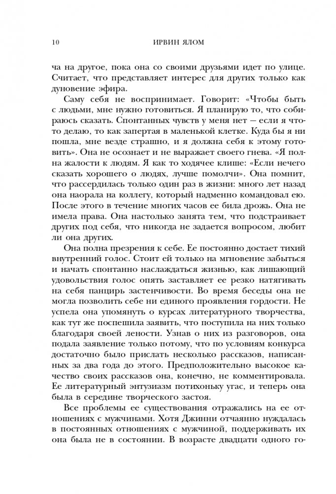 "Хроники исцеления" – необычная книга, которую Ирвин Ялом написал не один, а в соавторстве. Джинни Элкин – псевдоним молодой писательницы, которой был поставлен диагноз "шизофрения". После неудачных занятий групповой терапией она начинает индивидуальный курс лечения под руководством доктора Ялома. "Хроники исцеления" – это дневники пациентки и психотерапевта, в которых они подробно описывают свои мысли и чувства. В книге Ялом проявляет свой великолепный талант беллетриста: читатель открывает для себя личность Джинни, узнает в ее переживаниях себя, получает поддержку от доктора, злится и смеется вместе с героями, словно сам сидит напротив психотерапевта и ведет с ним свой собственный откровенный разговор.