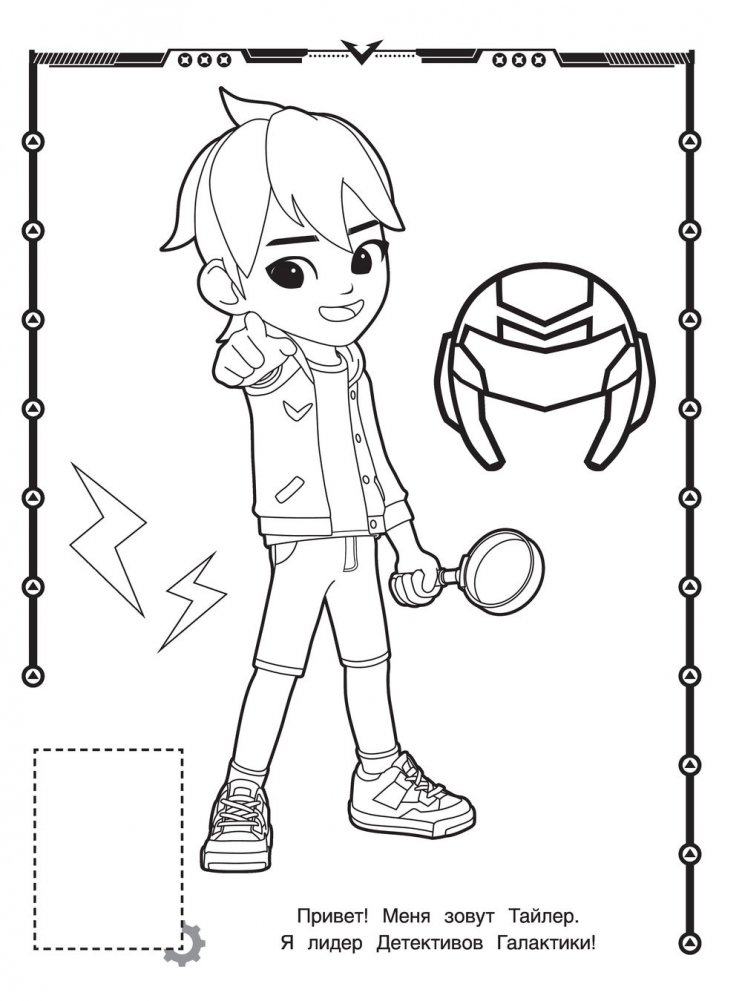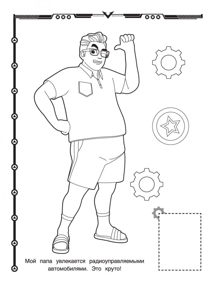 Раскрась картинку, взяв за образец яркие наклейки, — на каждой странице есть место, куда можно приклеить изображения героев.