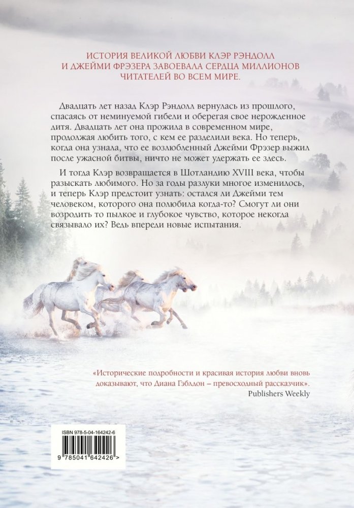 Двадцать лет назад Клэр Рэндолл вернулась из прошлого, спасаясь от неминуемой гибели и оберегая свое нерожденное дитя. Двадцать лет она прожила в современном мире, продолжая любить того, с кем ее разделили века. Но теперь, когда она узнала, что ее возлюбленный Джейми Фрэзер выжил после ужасной битвы, ничто не может удержать ее здесь.
