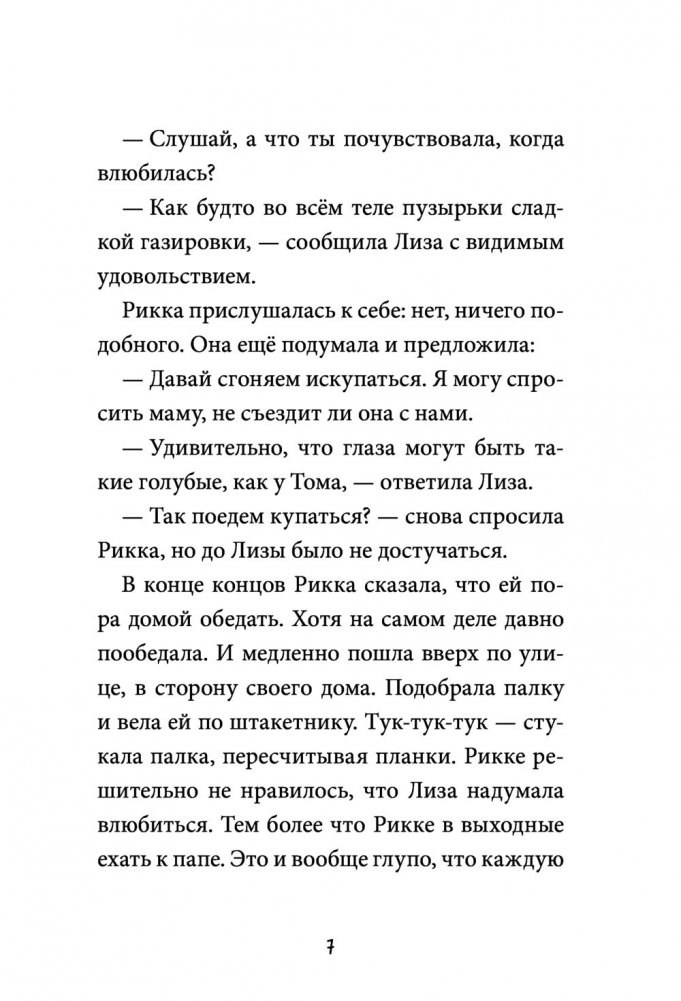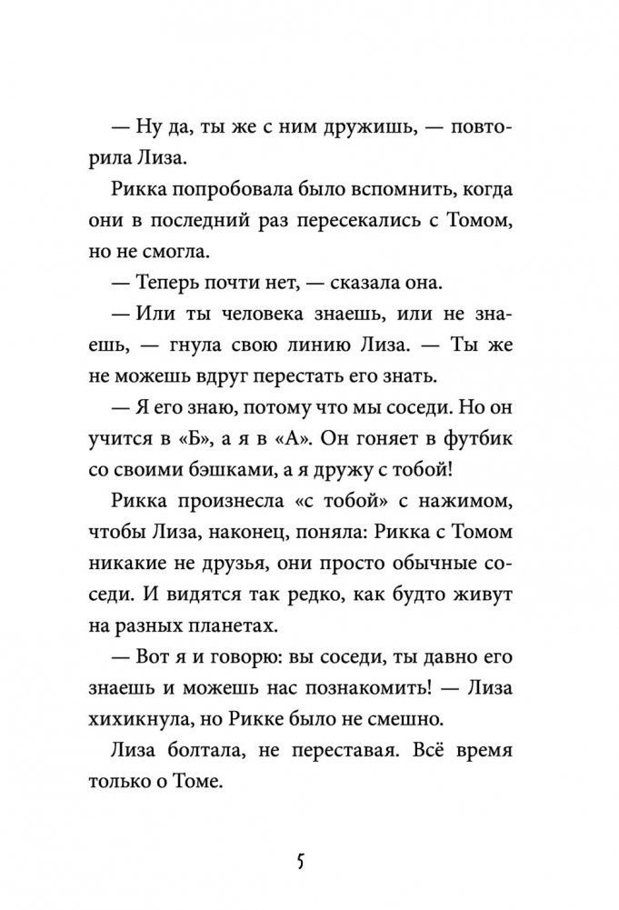 Лучшая подруга Рикки, Лиза, влюбилась в мальчика из параллельного класса и теперь говорит только о нем. Но Рикку совсем не интересует любовь и мальчишки! У нее и так хватает проблем: она живет с мамой, отчимом и сводными братом и сестрой, у ее папы новая семья в другом городе, а тут еще и в соседний дом переехал мальчик ее возраста... И в довершении всего она насмерть разругалась с Лизой. Как же ей все исправить?