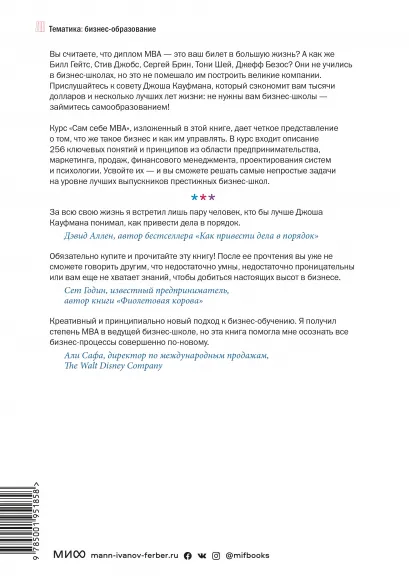 Джош Кауфман — выдающийся менеджер, не получивший классического бизнес-образования. Он сознательно выбрал нестандартный путь, решив не идти на курсы MBA, но получить самообразование одновременно начав работать full-time в компании Procter&Gamble. Однако простой вопрос — зачем же нужен диплом MBA и с помощью каких ресурсов можно получить такое же или превосходящее по качеству образование — не давал ему покоя.