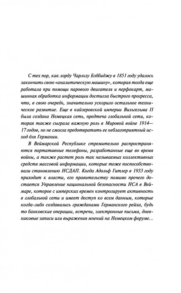 История XIX века изменилась, когда Чарльз Бэббидж создал аналитическую машину, запустив кибернетическую революцию, и к 1930‑м годам в Европе уже появились компьютеры, интернет, электронная почта и активное сетевое общение. Веймар, 1942 год. Здесь находится Управление национальной безопасности, которое со времен Вильгельма II контролирует активность в глобальной сети и имеет доступ ко всем данным, которые когда‑либо создавались гражданами Германского рейха, будь то банковские операции, встречи, электронные письма, дневниковые записи или выражения мнений на Немецком форуме. В нем работает программистка Хелена Боденкамп, дочь знаменитого на всю Германию хирурга и евгеника. Ее личная преданность режиму начинает рушиться под воздействием личных обстоятельств и одновременно она узнает, что начальник ее отдела, Ойген Леттке, сын героя Первой мировой войны, начинает использовать систему в собственных целях. Только ни он, ни она еще не подозревают, на что способны новые технологии в исторических условиях Германии 1930–1940‑х годов и насколько страшными могут быть технологии, кажущиеся такими привычными.