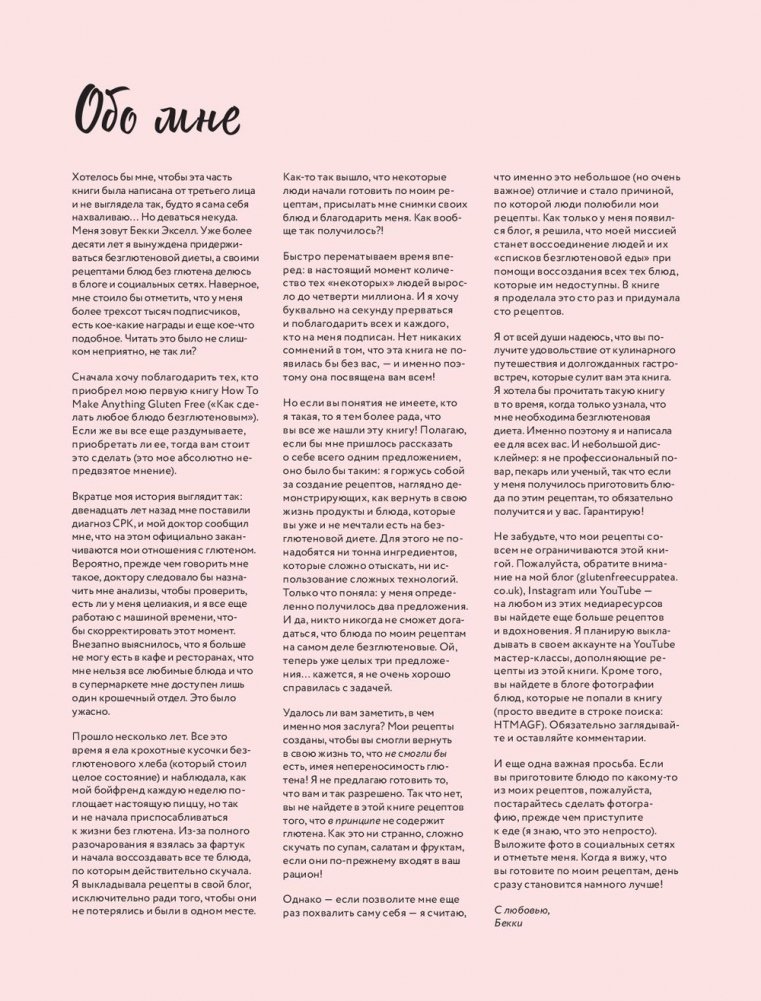 Бекки Экселл уже много лет готовит без глютена и делится своими рецептами с подписчиками в соцсетях. Её миссия — показать, что готовить без глютена не значит ограничивать себя в выборе блюд и питаться очевидными супами, салатами и фруктами. Она научит Вас готовить те блюда, которые вы считали недоступными для себя. От настоящего куриного чоу-мейна до пад-тай, от пончиков до лимонного пирога, от чизкейка до профитролей, от французских багетов до пиццы. А ещё в этой книге — безмолочные веганские и вегетарианские варианты приготовления блюд и множество проверенных советов о том, как любое блюдо сделать безглютеновым.
