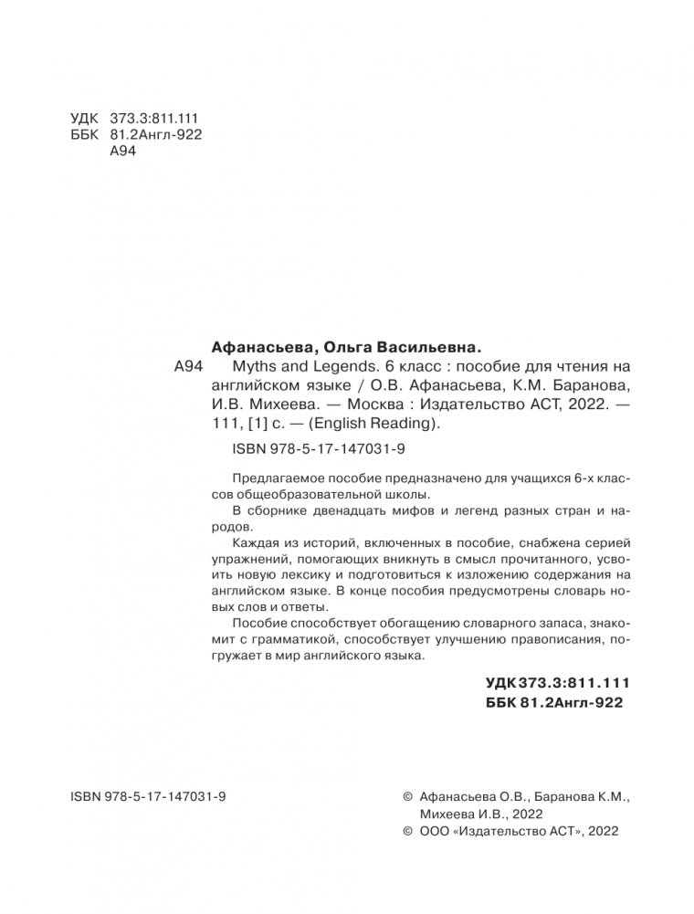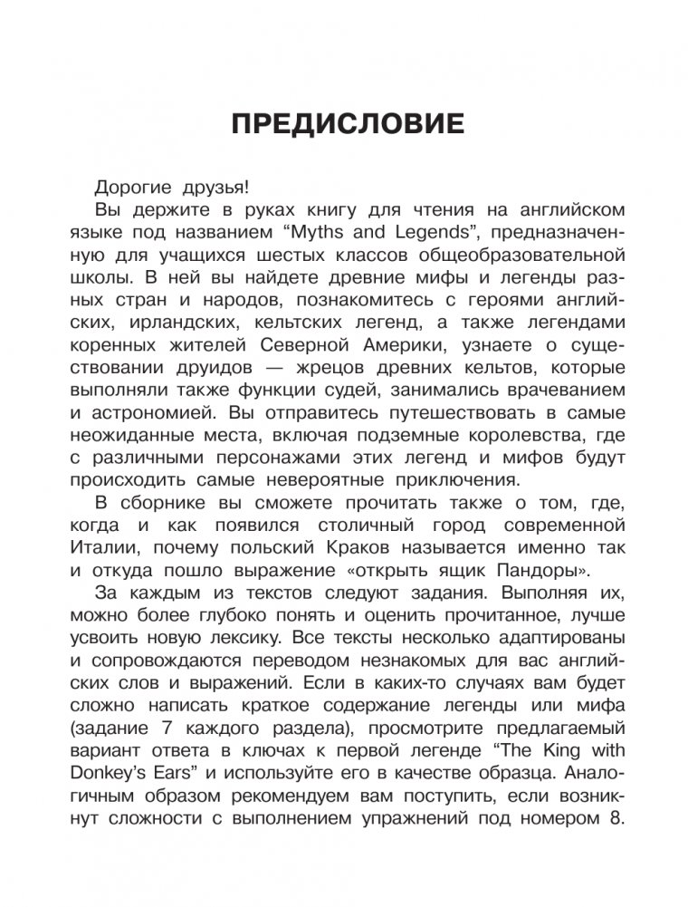 Предлагаемое пособие предназначено для учащихся 6-х классов общеобразовательной школы.В сборнике двенадцать мифов и легенд разных стран и народов.Каждая из историй, включенных в пособие, снабжена серией упражнений, помогающих вникнуть в смысл прочитанного, усвоить новую лексику и подготовиться к изложению содержания на английском языке. В конце пособия предусмотрены словарь новых слов и ответы.Пособие способствует обогащению словарного запаса, знакомит с грамматикой, способствует улучшению правописания, погружает в мир английского языка.