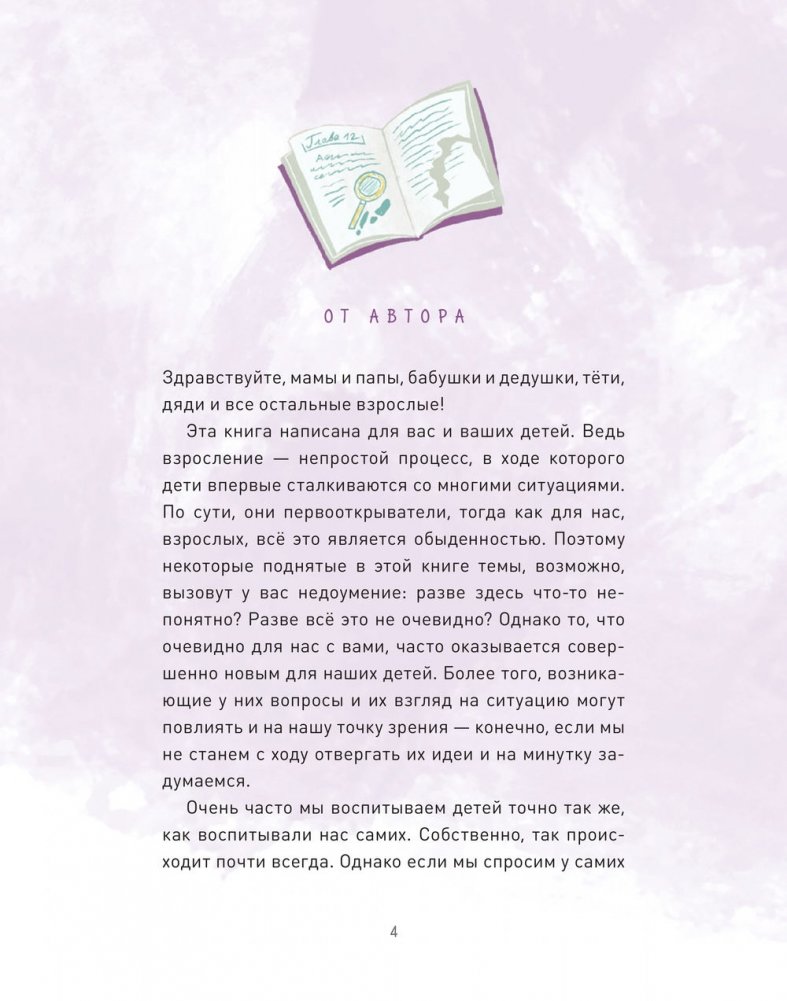 10 историй из жизни двух детей — Миры и Гоши — сопровождаются комментариями психологов и списком вопросов. Эти вопросы помогут обсудить проблемы обмана, воровства, дружбы, гендерных игр — тем, с которыми сталкивается каждая семья.