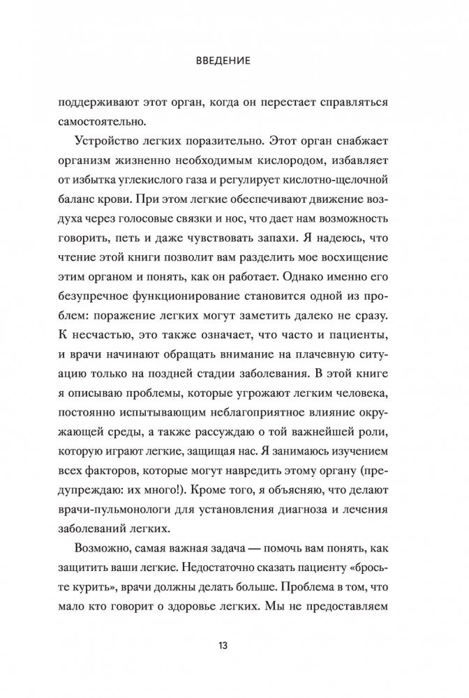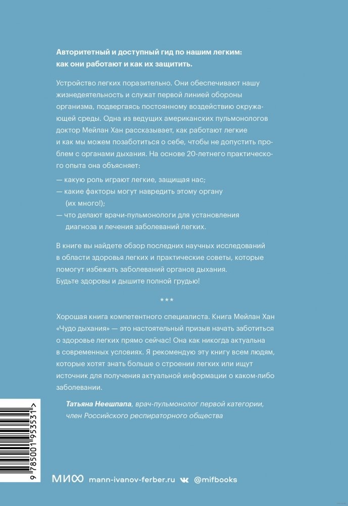 Доктор Хан объясняет чудо дыхания и показывает, что легкие служат первой линией обороны организма. Она дает обзор последних научных исследований о рисках для органов дыхания, включая загрязнение воздуха в помещении и вне его, курение, дым лесных пожаров и вирусы. А главное — предлагает практические советы, которые помогут поддержать здоровье легких.