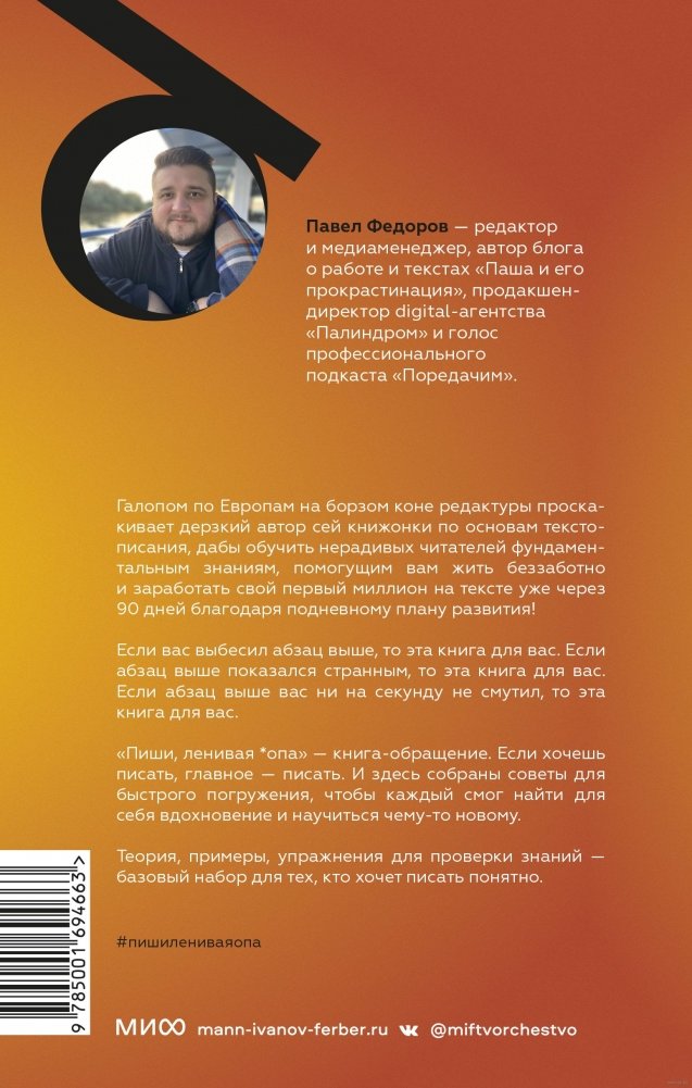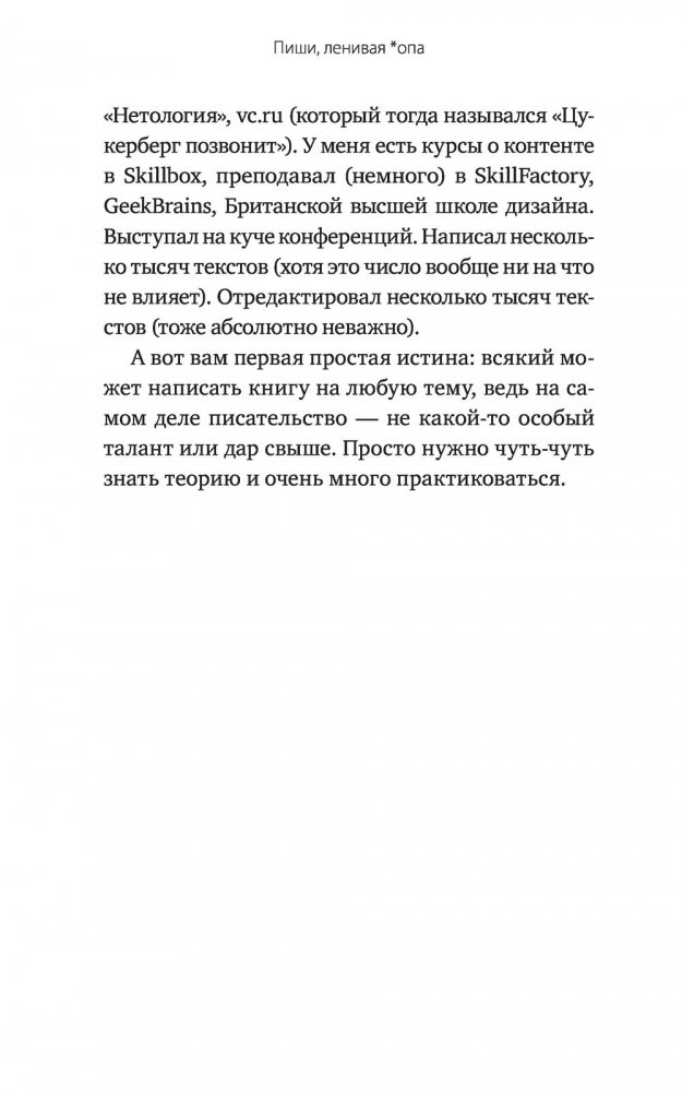«Пиши, ленивая *опа» — книга-обращение. Если хочешь писать, главное — писать. И здесь собраны советы для быстрого погружения, чтобы каждый смог найти для себя вдохновение и научиться чему-то новому.