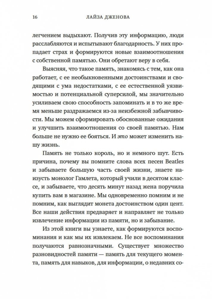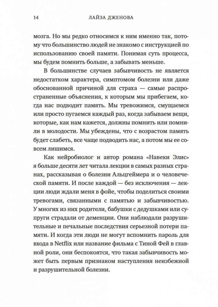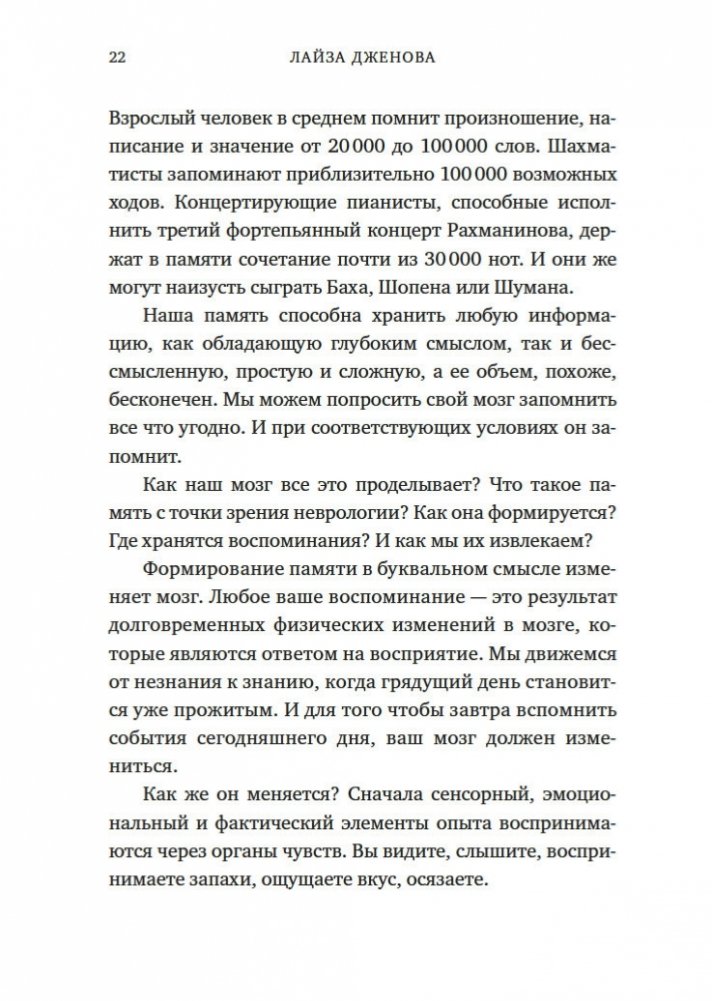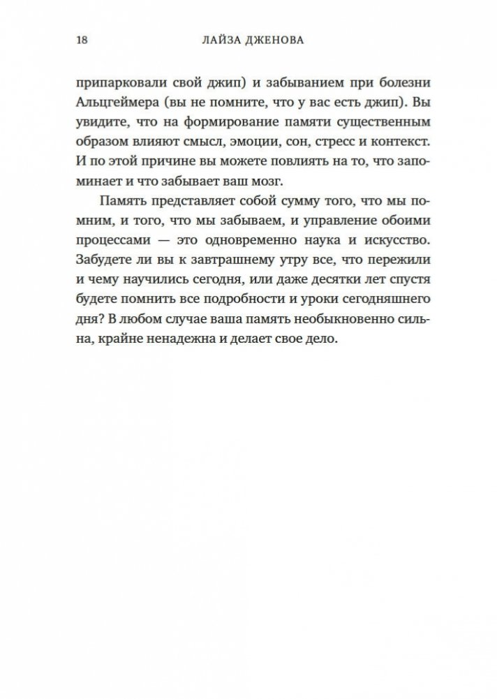 Увлекательное исследование особенностей человеческой памяти, проведенное нейробиологом из Гарварда, автором бестселлера «Все еще Элис». Из этой книги, права на издание которой приобрели 9 стран, вы узнаете, как формируется память, что происходит с забытыми воспоминаниями (они недоступны лишь временно или стираются навсегда?) и почему одни виды информации хранятся в памяти лишь несколько секунд, а другие — всю жизнь. Вы поймете разницу между нормальной забывчивостью и забывчивостью, вызванной болезнью Альцгеймера, узнаете, как сильно влияют на память смысл, эмоции, сон и контекст. Понимая принципы работы памяти, ее естественные недостатки и потенциальную суперсилу, вы сможете значительно усилить свою способность запоминать, а также меньше волноваться, когда вы что-то забудете.