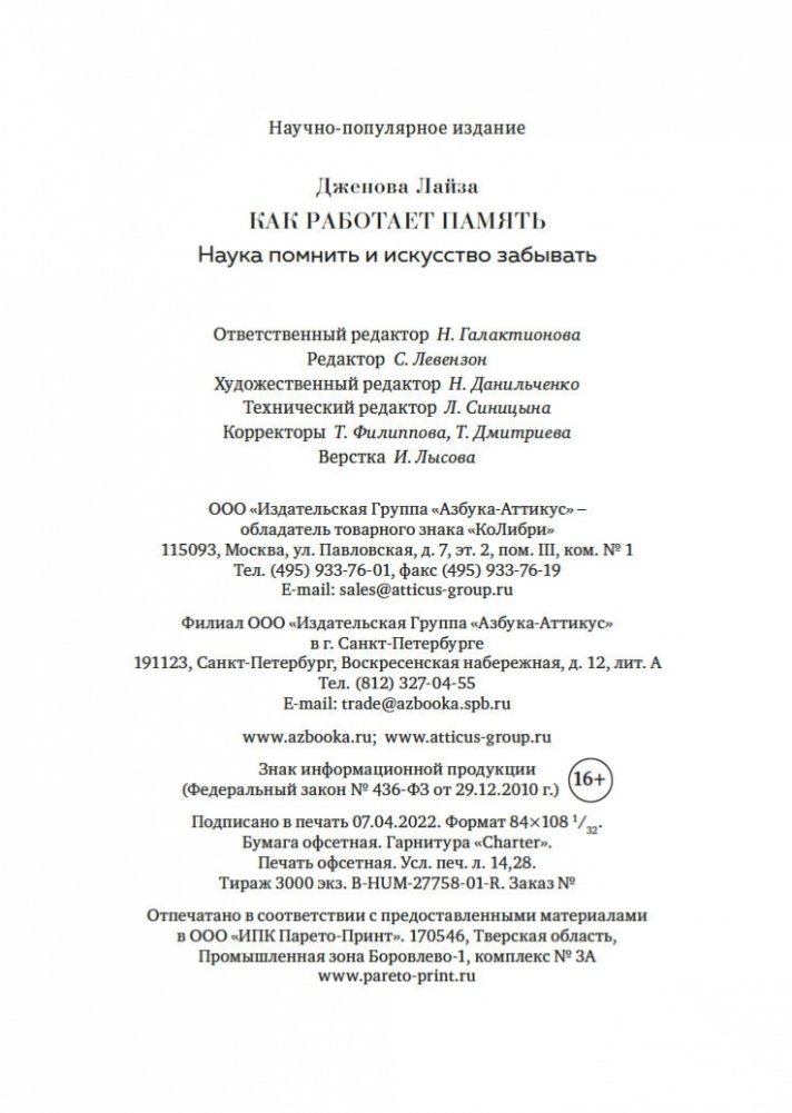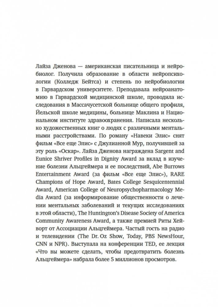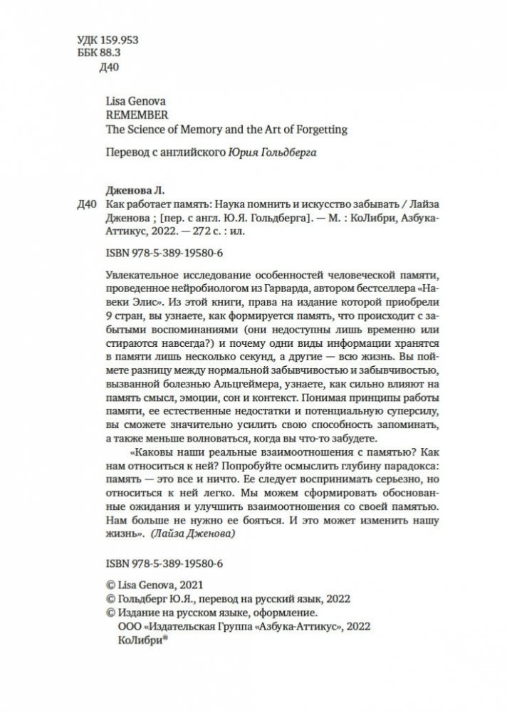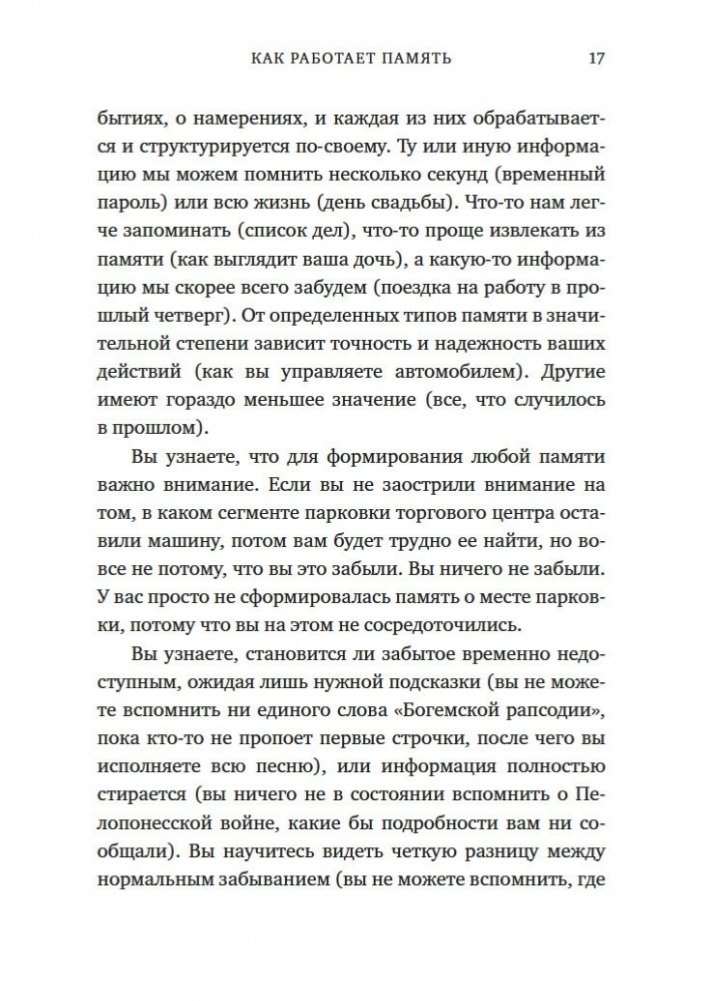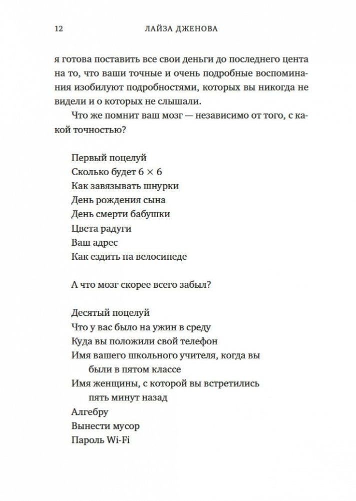 Увлекательное исследование особенностей человеческой памяти, проведенное нейробиологом из Гарварда, автором бестселлера «Все еще Элис». Из этой книги, права на издание которой приобрели 9 стран, вы узнаете, как формируется память, что происходит с забытыми воспоминаниями (они недоступны лишь временно или стираются навсегда?) и почему одни виды информации хранятся в памяти лишь несколько секунд, а другие — всю жизнь. Вы поймете разницу между нормальной забывчивостью и забывчивостью, вызванной болезнью Альцгеймера, узнаете, как сильно влияют на память смысл, эмоции, сон и контекст. Понимая принципы работы памяти, ее естественные недостатки и потенциальную суперсилу, вы сможете значительно усилить свою способность запоминать, а также меньше волноваться, когда вы что-то забудете.