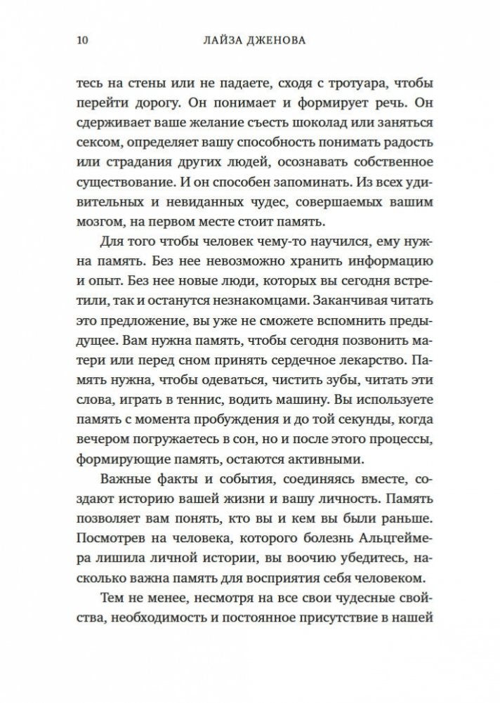 «Каковы наши реальные взаимоотношения с памятью? Как нам относиться к ней? Попробуйте осмыслить глубину парадокса: память — это все и ничто. Ее следует воспринимать серьезно, но относиться к ней легко. Мы можем сформировать обоснованные ожидания и улучшить взаимоотношения со своей памятью. Нам больше не нужно ее бояться. И это может изменить нашу жизнь». (Лайза Дженова)