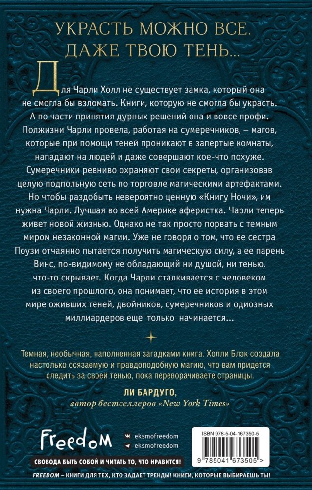 Полжизни Чарли провела, работая на сумеречников, магов, которые при помощи теней проникают в запертые комнаты, нападают на людей и даже совершают кое-что похуже. Сумеречники ревниво охраняют свои секреты, организовав целую подпольную сеть по торговле магическими артефактами. Но чтобы раздобыть невероятно ценную «Книгу ночи», им нужна Чарли. Лучшая во всей Америке аферистка.
