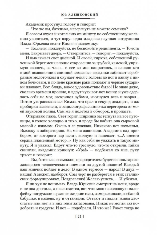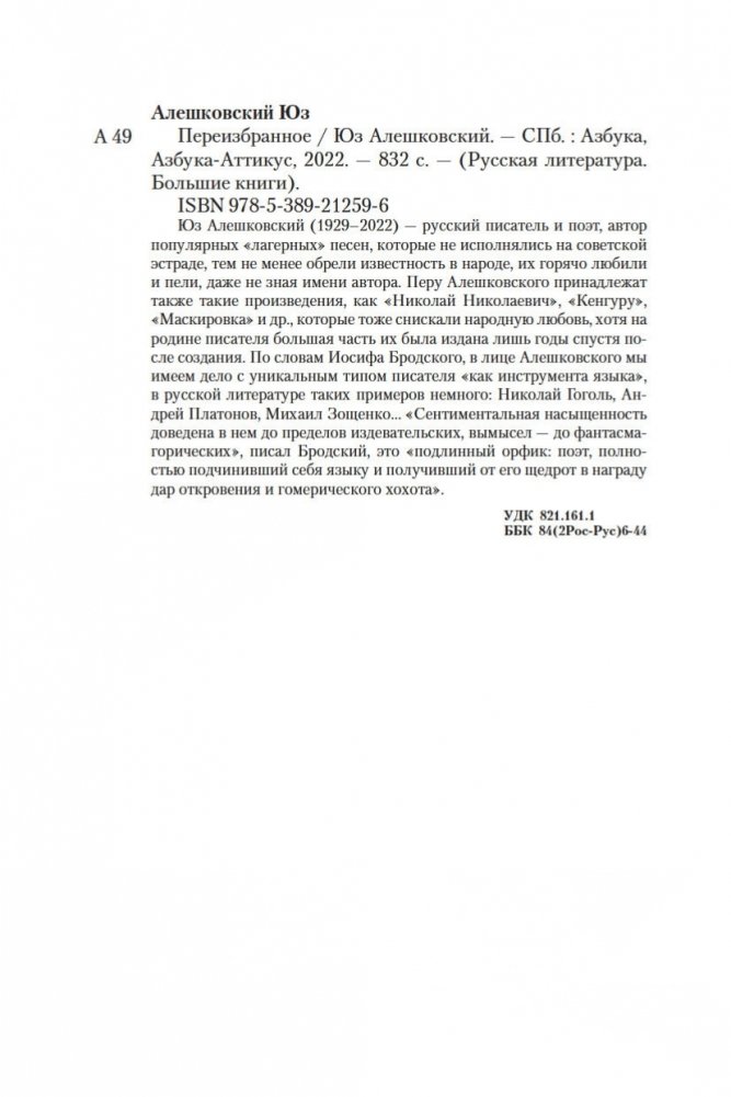Юз Алешковский (1929–2022) — русский писатель и поэт, автор популярных «лагерных» песен, которые не исполнялись на советской эстраде, тем не менее обрели известность в народе, их горячо любили и пели, даже не зная имени автора. Перу Алешковского принадлежат также такие произведения, как «Николай Николаевич», «Кенгуру», «Маскировка» и др., которые тоже снискали народную любовь, хотя на родине писателя большая часть их была издана лишь годы спустя после создания. По словам Иосифа Бродского, в лице Алешковского мы имеем дело с уникальным типом писателя «как инструмента языка», в русской литературе таких примеров немного: Николай Гоголь, Андрей Платонов, Михаил Зощенко... «Сентиментальная насыщенность доведена в нем до пределов издевательских, вымысел — до фантасмагорических», писал Бродский, это «подлинный орфик: поэт, полностью подчинивший себя языку и получивший от его щедрот в награду дар откровения и гомерического хохота»