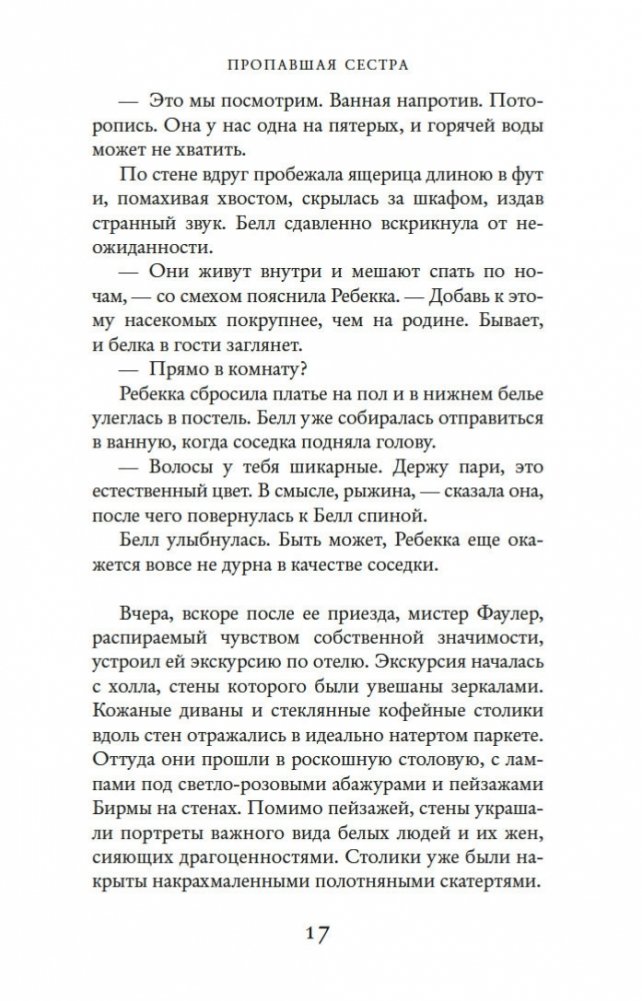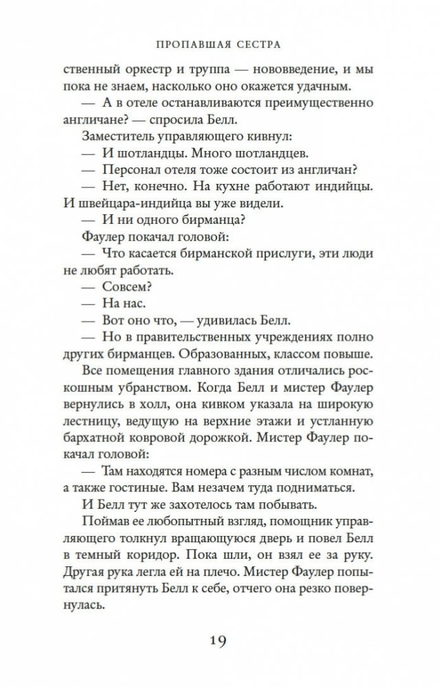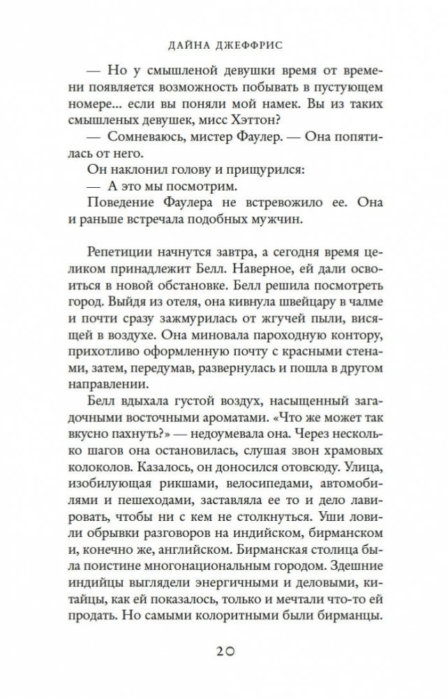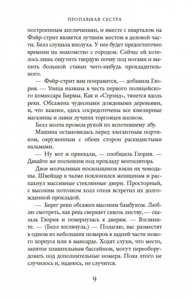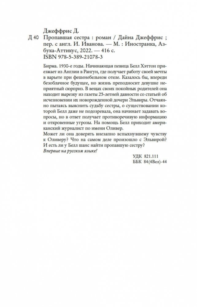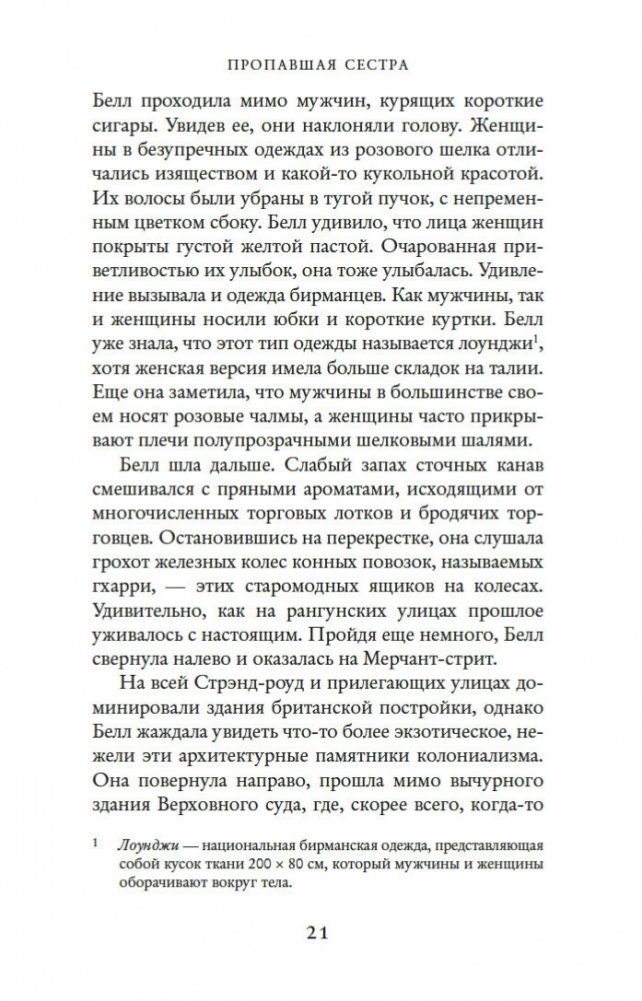 Бирма. 1930-е годы. Начинающая певица Белл Хэттон приезжает из Англии в Рангун, где получает работу своей мечты в варьете при фешенебельном отеле. Казалось бы, впереди безоблачное будущее, но жизнь преподносит девушке неприятный сюрприз. В вещах своих покойных родителей она находит вырезку из газеты 25-летней давности со статьей об исчезновении их новорожденной дочери Эльвиры. Отчаянно пытаясь выяснить судьбу сестры, о существовании которой Белл даже не подозревала, она начинает задавать вопросы, но в ответ получает противоречивую информацию и откровенные угрозы. На помощь Белл приходит американский журналист по имени Оливер. Может ли она доверять внезапно вспыхнувшему чувству к Оливеру? Что на самом деле произошло с Эльвирой? И есть ли у Белл шанс найти пропавшую сестру? Впервые на русском языке!