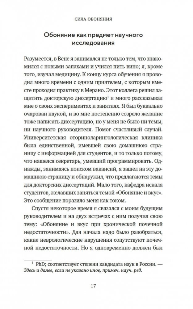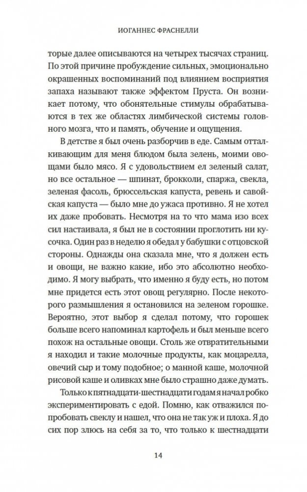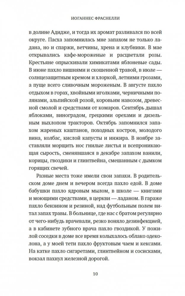 «Несмотря на то что мы обоняем всегда — собственно, мы воспринимаем запахи еще до рождения, — и несмотря на то что обоняние имеет непосредственную “проводную” связь с лимбической системой, а значит, с нашим чувственным миром, люди в большинстве своем считают обоняние наименее значимым из пяти чувств. При этом нарушение обоняния не только снижает качество жизни, оно может быть первым симптомом различных заболеваний. Так что вполне оправданным является повышенное внимание к обонянию. Мы можем сенсибилизировать наше обоняние, даже улучшить его и таким способом тренировать наш мозг. Самое прекрасное, что нам не нужны для этого дорогие аппараты, мы должны просто обращать больше внимания на свое обоняние и чаще говорить друг с другом о запахах». (Иоганнес Фраснелли)