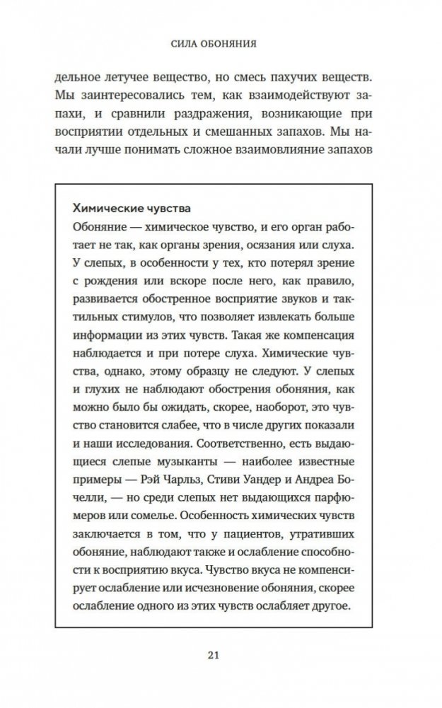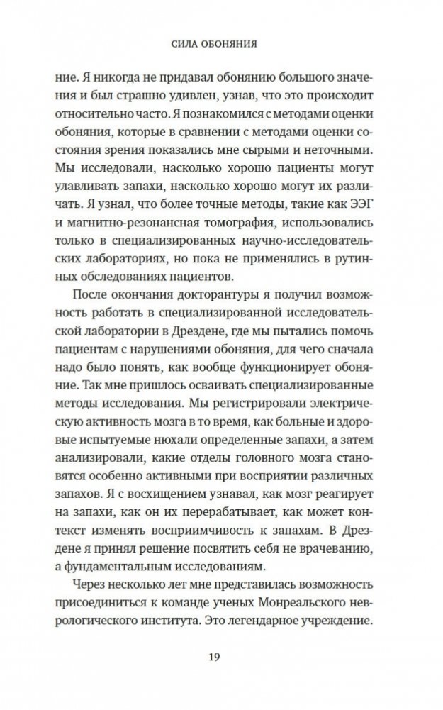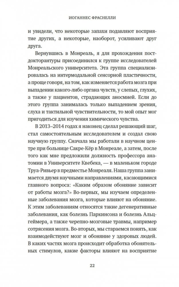 Обоняние оказывает наиболее сильное влияние на наши эмоции по сравнению с другими чувствами и контролирует наше поведение значительнее, чем мы предполагаем. Нейробиолог, профессор анатомии Университета Квебека в Труа-Ривьере (Канада) Иоганнес Фраснелли доступно объясняет, каким образом тренировка обоняния влияет на мозг человека, как меняют наше обоняние тревога и депрессия, как связана потеря обоняния с нейрогенеративными заболеваниями, а также затрагивает ряд других любопытных тем — не только из области нейробиологии, анатомии и психологии, но и из сферы пищевых предпочтений жителей разных стран, открывая перед нами интереснейший мир запахов и ощущений.