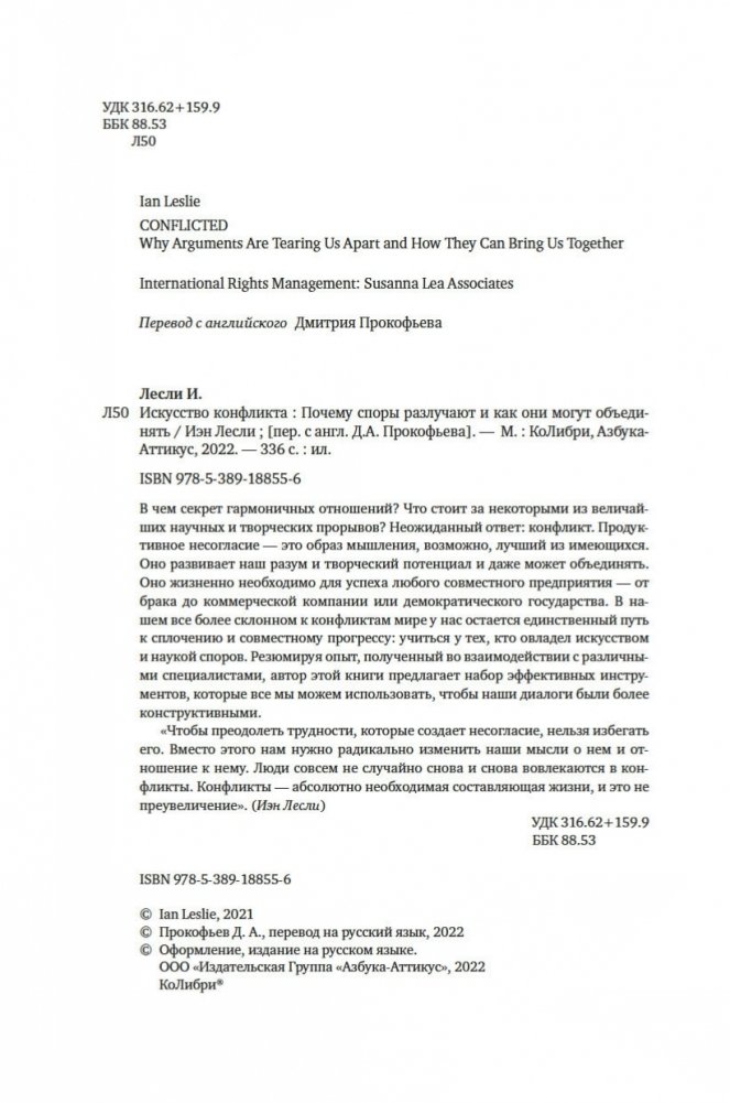 В чем секрет гармоничных отношений? Что стоит за некоторыми из величайших научных и творческих прорывов? Неожиданный ответ: конфликт. Продуктивное несогласие — это образ мышления, возможно, лучший из имеющихся. Оно развивает наш разум и творческий потенциал и даже может объединять. Оно жизненно необходимо для успеха любого совместного предприятия — от брака до коммерческой компании или демократического государства. В нашем все более склонном к конфликтам мире у нас остается единственный путь к сплочению и совместному прогрессу: учиться у тех, кто овладел искусством и наукой споров. Резюмируя опыт, полученный во взаимодействии с различными специалистами, автор этой книги предлагает набор эффективных инструментов, которые все мы можем использовать, чтобы наши диалоги были более конструктивными.