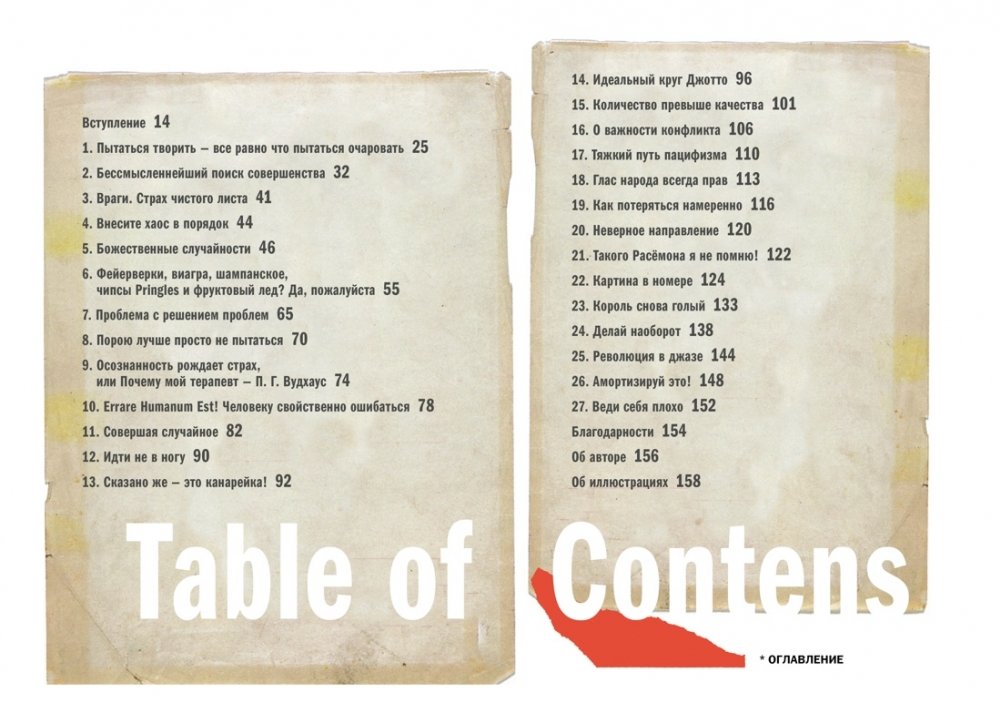 «Я говорю не о том, как принять свои промахи или научиться на них, а в следующий раз сделать лучше. Суть в том, чтобы на самом деле ошибаться намеренно. Ведь именно ошибки помогают создать нечто оригинальное — и обрести свободу, отклеиться, когда вы залипли. Сделать это можно по-разному. Истории, которые последуют, — примеры идей: добавьте случайность, предпочтите количество качеству, внесите хаос в порядок, пойдите неверным путем… Удивите себя — и вы удивите других; это бесценно в мире, в котором, кажется, уже все придумано. А еще это весело! Начнем же прямо сейчас». (Лори Розенвальд)