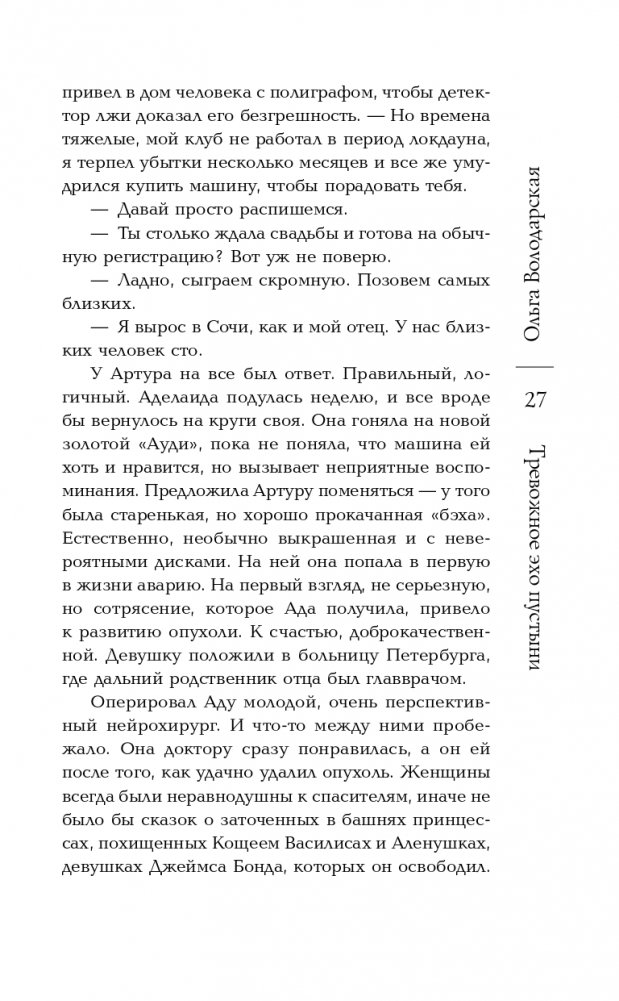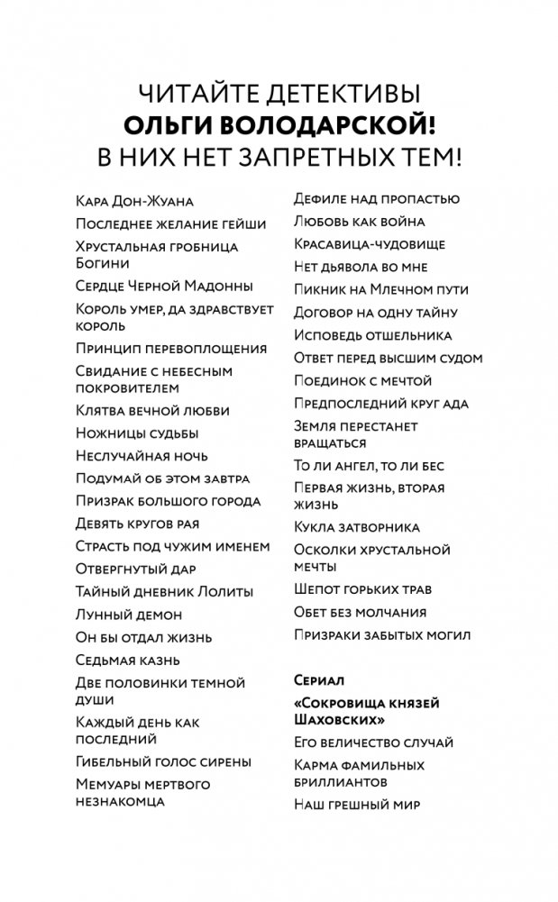 Ольга Володарская — известный писатель, автор книг в жанре остросюжетного романа. Ее детективы сочетают остроту современной прозы и напряженность психологического триллера. В них вы найдете все, что хотели, но боялись узнать. Поэтому серия книг, в которой выходят книги Ольги Володарской, так и называется — «Никаких запретных тем»!