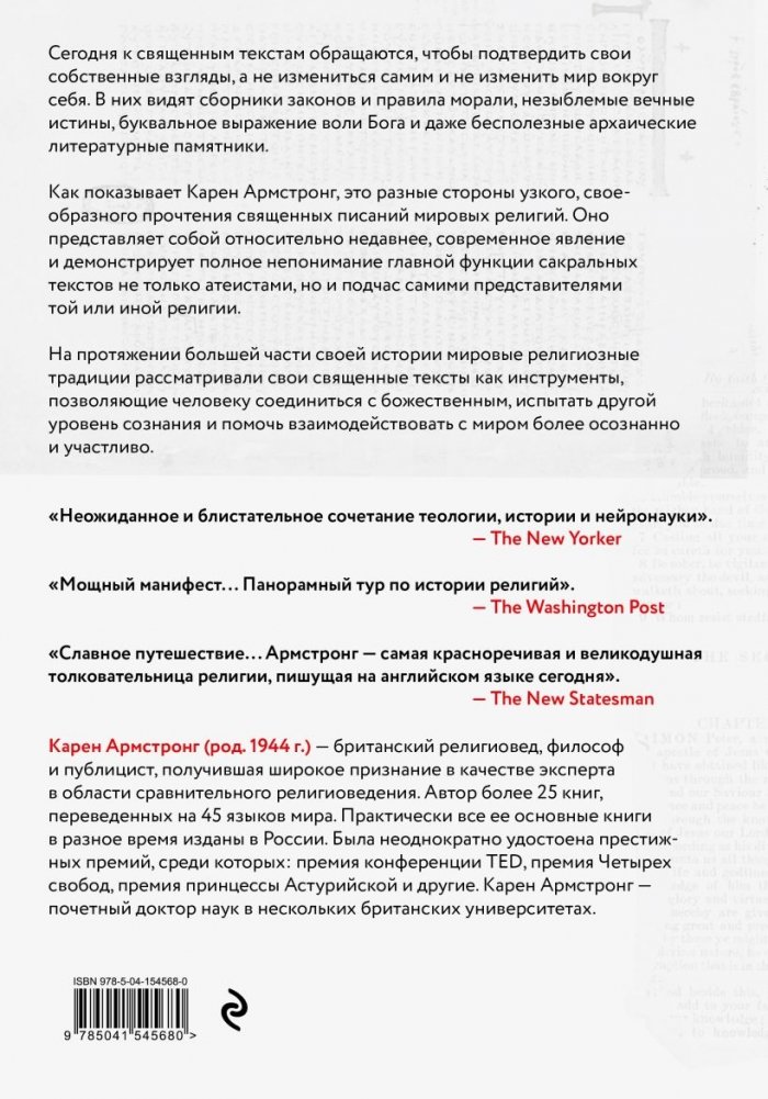 Сегодня к священным текстам обращаются, чтобы подтвердить свои собственные взгляды, а не измениться самим и не изменить мир вокруг себя. В них видят сборники законов и правила морали, незыблемые вечные истины, буквальное выражение воли Бога и даже бесполезные архаические литературные памятники.