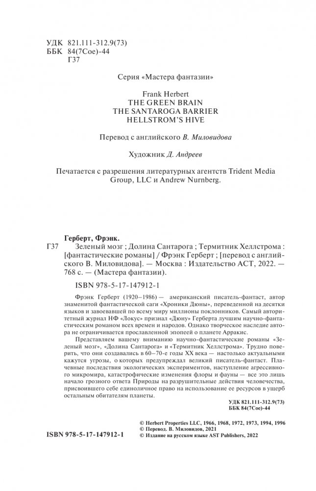 Представляем вашему вниманию научно-фантастические романы "Зеленый мозг", "Долина Сантарога" и "Термитник Хеллстрома". Трудно поверить, что они создавались в 60–70-е годы ХХ века – настолько актуальными кажутся угрозы, о которых предупреждал великий писатель-фантаст. Плачевные последствия экологических экспериментов, наступ-ление агрессивного микромира, катастрофические изменения флоры и фауны – все это лишь начало грозного ответа Природы на разрушительные действия человечества, присвоившего себе единоличное право на использование ее ресурсов в ущерб остальным обитателям планеты.