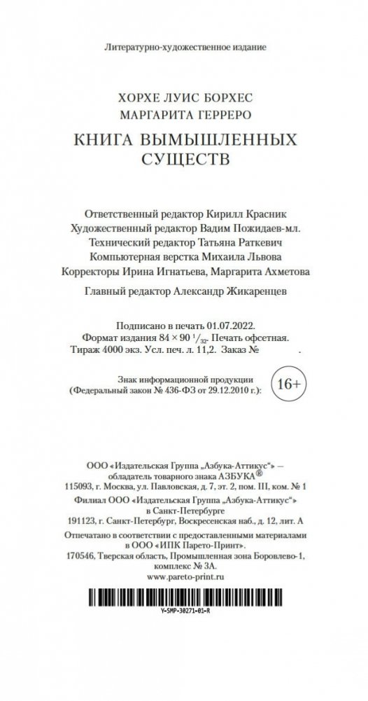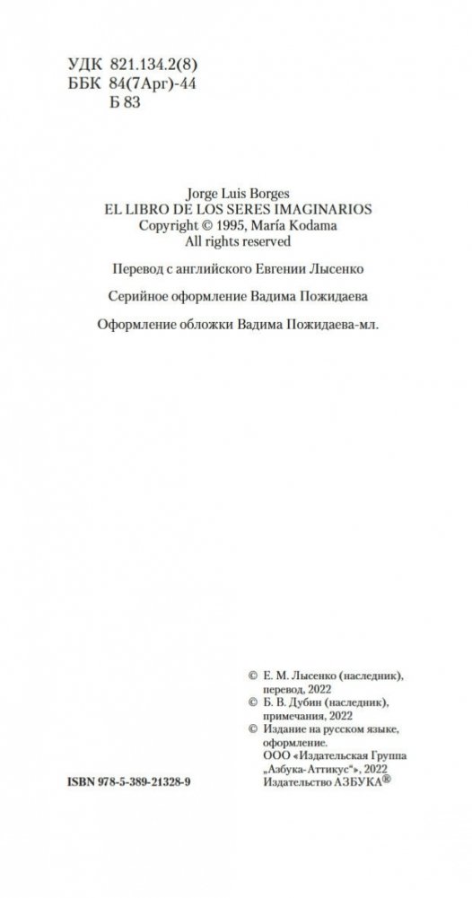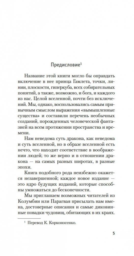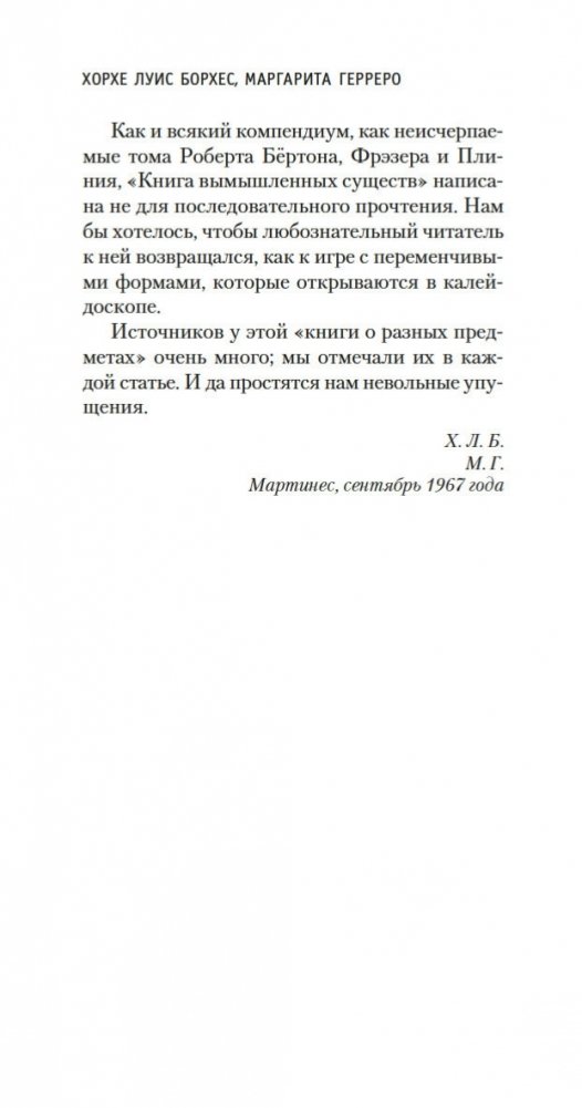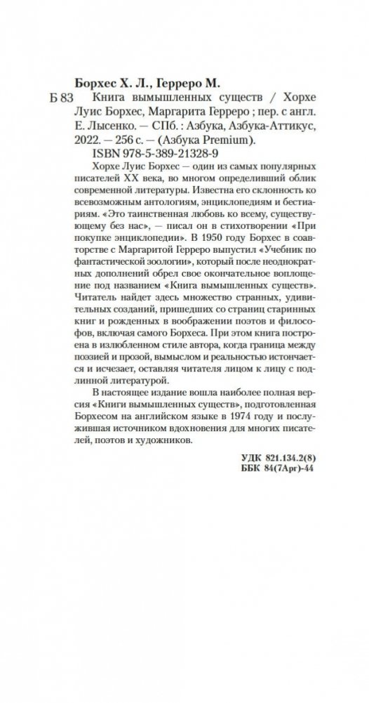 Хорхе Луис Борхес — один из самых популярных писателей ХХ века, во многом определивший облик современной литературы. Известна его склонность ко всевозможным антологиям, энциклопедиям и бестиариям. «Это таинственная любовь ко всему, существующему без нас», — писал он в стихотворении «При покупке энциклопедии». В 1950 году Борхес в соавторстве с Маргаритой Герреро выпустил «Учебник по фантастической зоологии», который после неоднократных дополнений обрел свое окончательное воплощение под названием «Книга вымышленных существ». Читатель найдет здесь множество странных, удивительных созданий, пришедших со страниц старинных книг и рожденных в воображении поэтов и философов, включая самого Борхеса. При этом книга построена в излюбленном стиле автора, когда граница между поэзией и прозой, вымыслом и реальностью истончается и исчезает, оставляя читателя лицом к лицу с подлинной литературой. В настоящее издание вошла наиболее полная версия «Книги вымышленных существ», подготовленная Борхесом на английском языке в 1974 году и послужившая источником вдохновения для многих писателей, поэтов и художников.